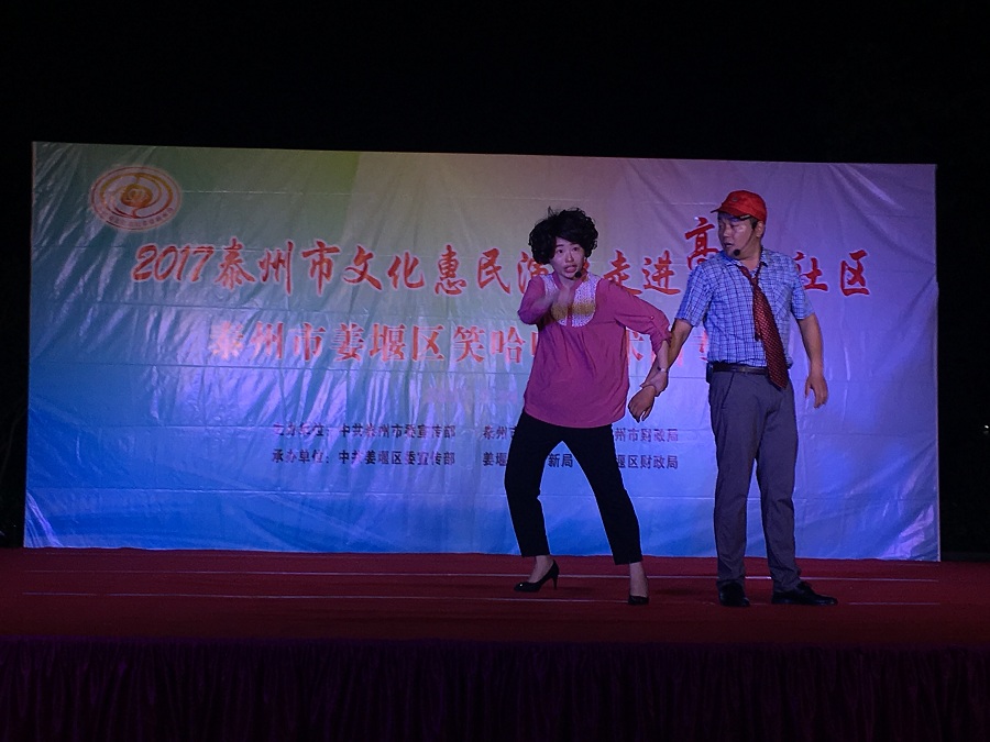 7月14日,姜堰区笑哈哈艺术团文化惠民专场演出走进罗塘街道髙陈社区。晚上7点30分演出在凤凰广场准时开始,现场表演的节目有舞蹈《红红火火大中华》、莲花落说唱《莲花一打笑哈哈》、方言韵白《回乡》、萨克斯演奏《北国之春》、喜剧小品《老娘舅》、天津快板《有话好好说》、相声《趣说泰州话》、越剧梁山伯与祝英台选段《十八相送》、表演唱《财政惠民乐农家》、以及独唱等11种形式、12个节目。整台演出时长115分钟,观众约700人左右。节目形式多样、内容丰富,尤其相声、快板、喜剧小品、方言韵白等语言类特色节目赢得了观众的阵阵笑声和掌声,受到了社区干部、群众的一致好评。