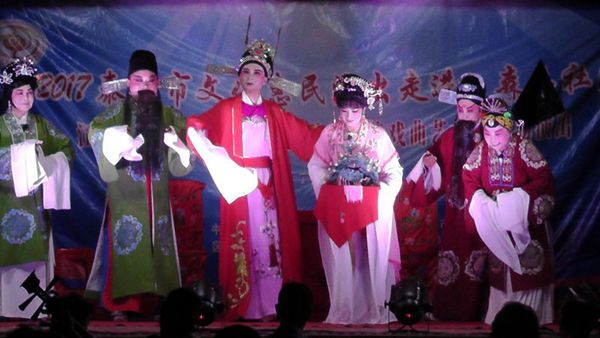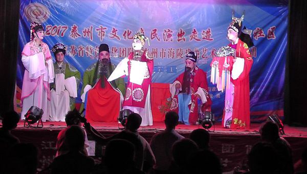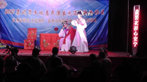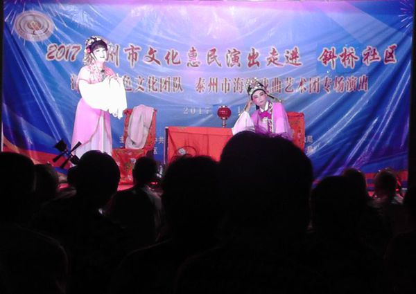 泰州市海陵戏曲艺术团于2017年7月1日晚7时30分在城东街道斜桥社区广场演出大型优秀传统扬剧——《碧玉簪》。我团参演人员25人。由于斜桥社区积极宣传,前来看戏的群众100余人,人民需要文化,文化需要人民,演出现场气氛热烈,观众掌声不断,演出圆满成功。这更加激起我们为老百姓排好戏、演好戏、唱好戏。把泰州市文化惠民演出活动锦上添花,更上一层楼。