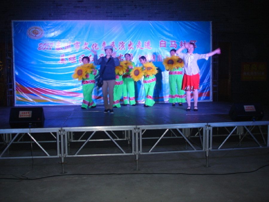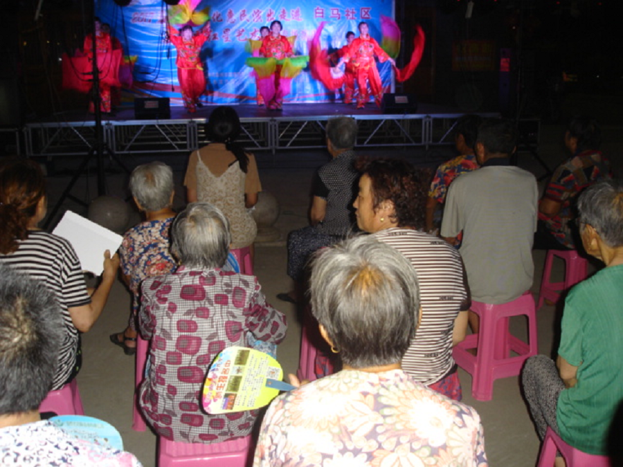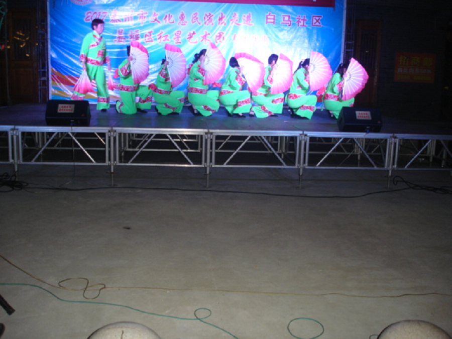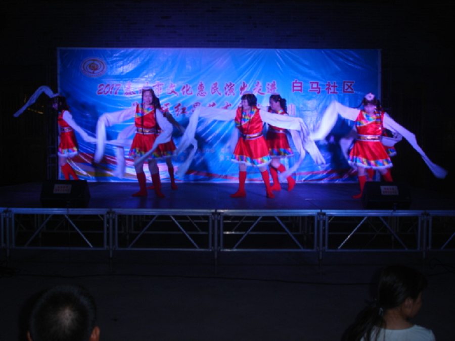 红星艺术团走进白马社区演出,社区的领导和社区的居民非常欢迎红星艺术团的到来。在欢呼笑语中红星艺术团的演员们闪亮彩演。节目一个比一个精彩,掌声不断,观众的情绪非常高涨。演出结束观众们还叮嘱明年再来!