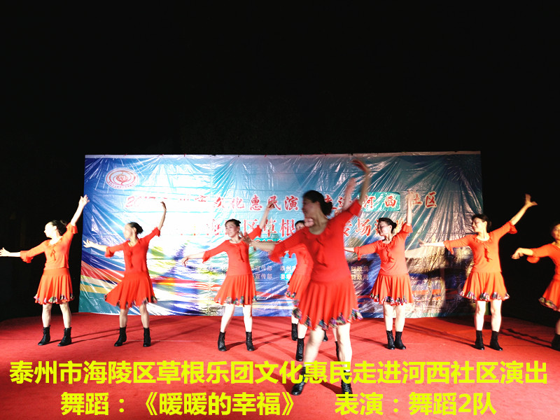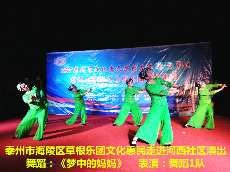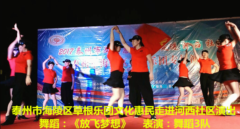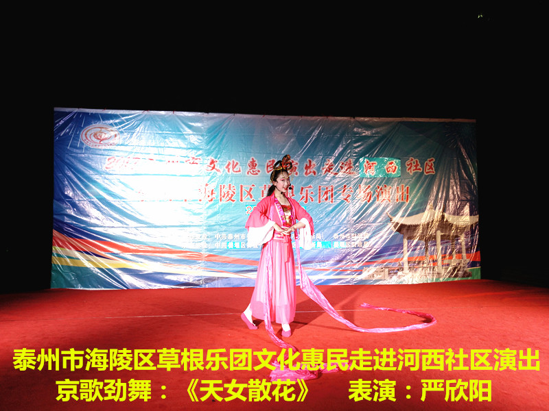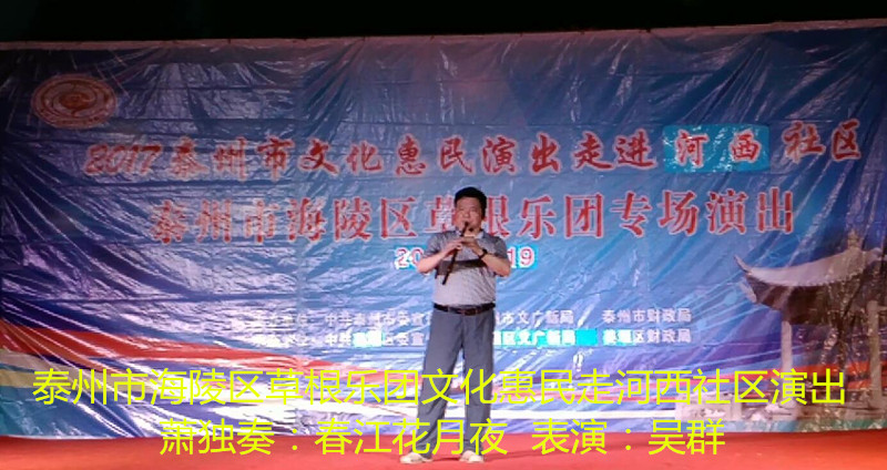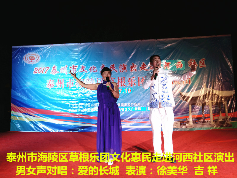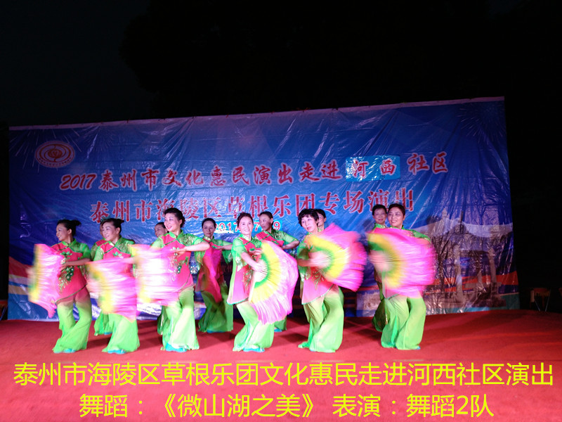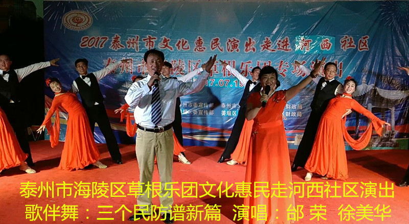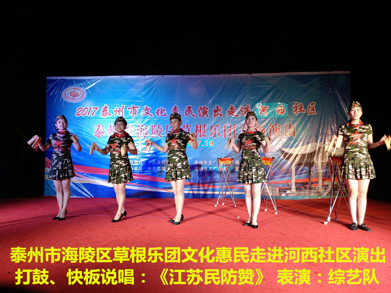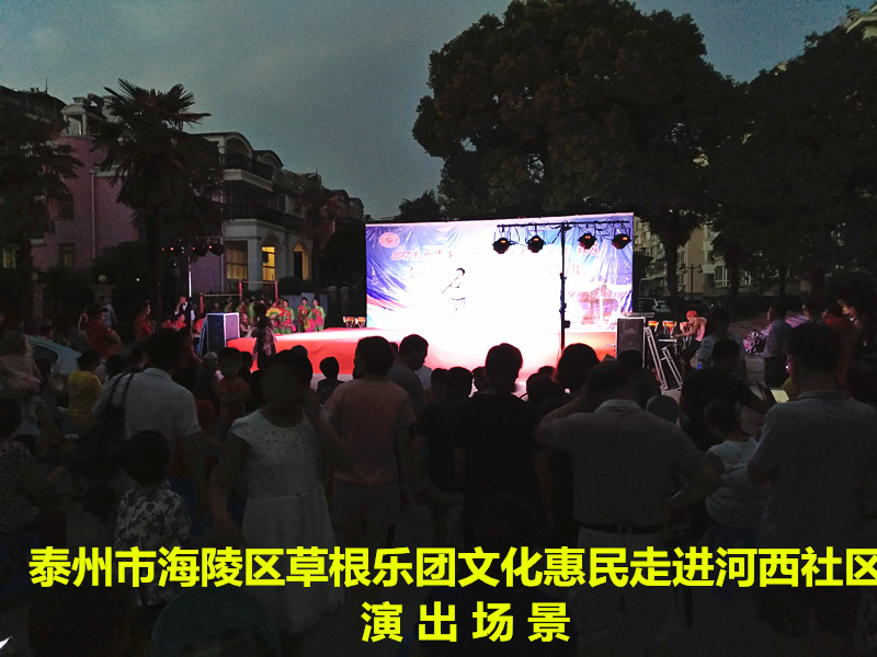 晚上七点2017泰州市文化惠民走进姜堰河西社区——泰州市海陵区草根乐团专场演出正式开始。首先出场的是社区点演的《三个民防谱新篇》节目,这个节目是草根乐团2个月前在江苏省第29届科技月宣传周成功演出的原创节目,居民朋友们用热情的掌声给予赞扬,接着萧独奏、民族舞、现代舞、独唱、对唱、打鼓、快板说唱、京剧表演唱、锡剧等陆续上场,观众们热情非常高,不但掌声如潮、欢呼声不断,还经常现场点节目,我团声乐队队长吉祥的演出观众非常喜欢,以致于完成了演出任务,观众仍不肯下台,主持人解释惠民演出规定不允许同一场一人超过二个节目,可观众强烈要求最后无法拒绝,只好作为非惠民演出正式节目为居民群众表演了他们现场点演节目,满足了居民要求,他们像过年一样的开心,整场节目中草根乐团把市委市政府对老百姓的关爱,把文化惠民的实质精神传递给了社区居民朋友,同时我们得到了社区群众的赞扬,也更加振奋精神,全团上下共同努力,为文化惠民再立新功。