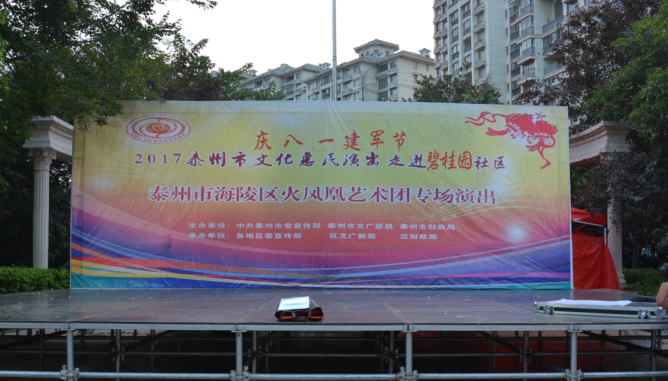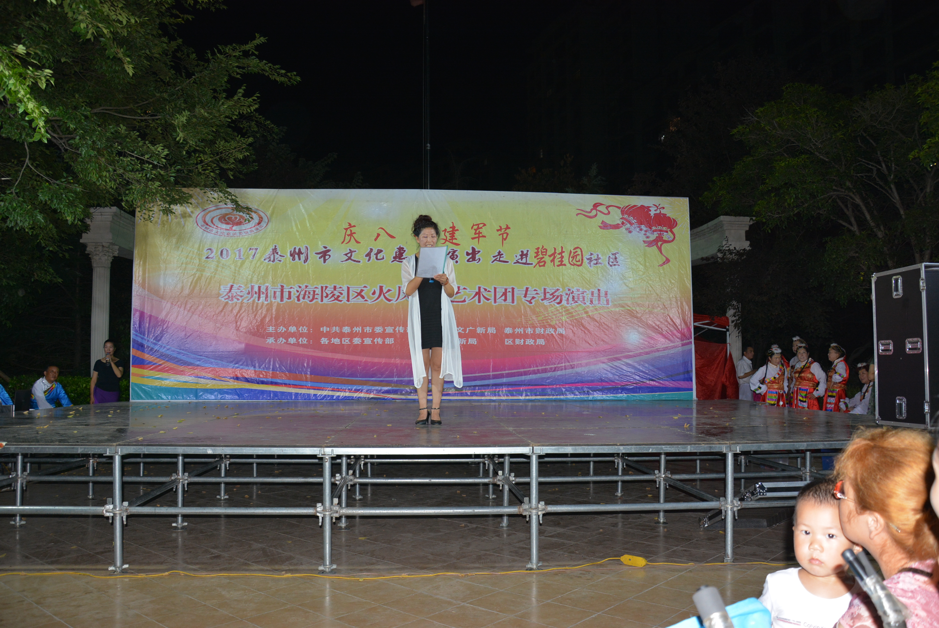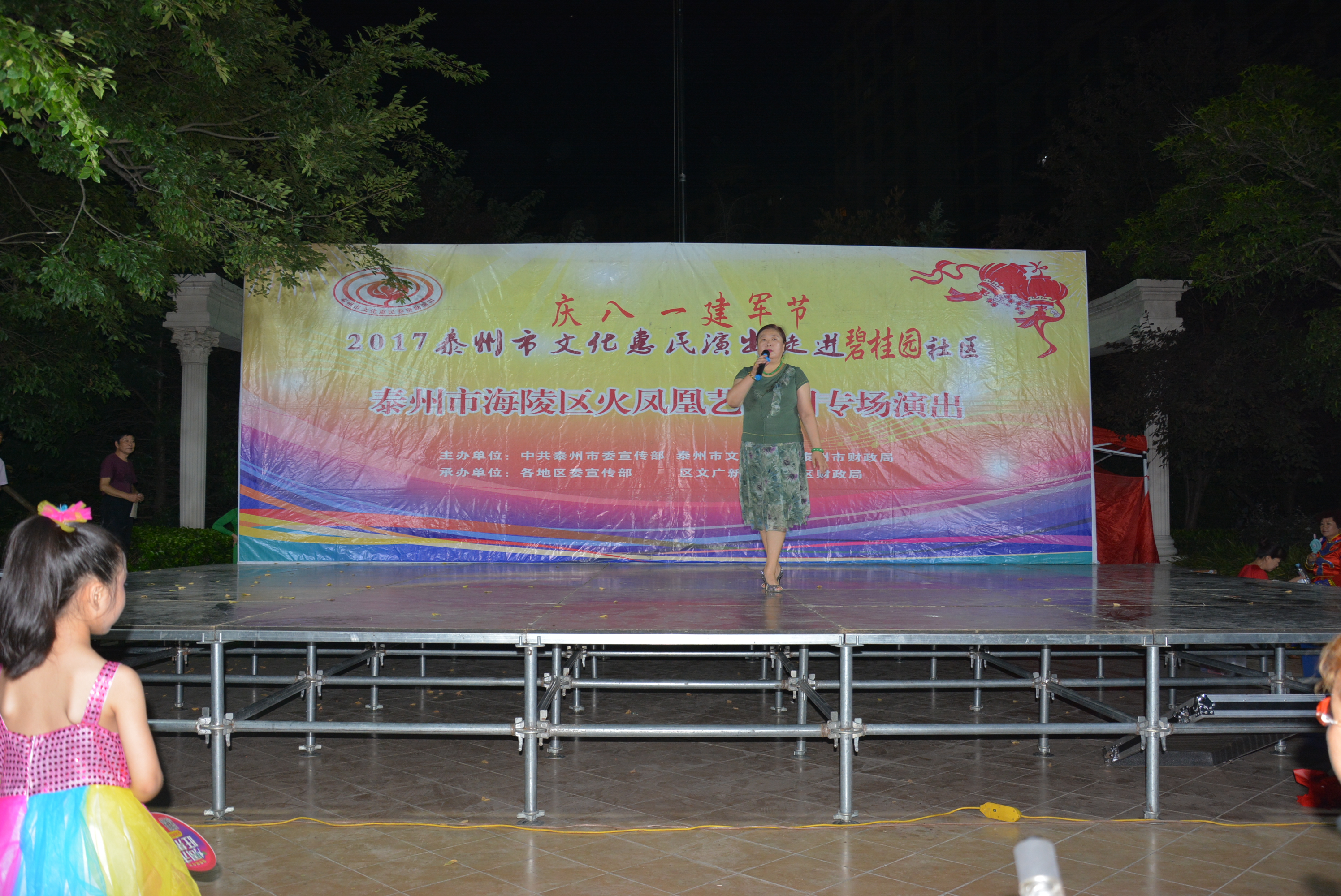 火凤凰艺术团应城东街道碧桂园社区邀请,2017年泰州市文化惠民专场演出于当晚7时30分在碧桂园社区上演。高温、酷暑,听起来就让人畏惧。然而火凤凰艺术团却激情奔放,为适应观众不同层次的文化欣赏需求,突出了庆八一建军节主题,弘扬社会正气,倡导诚实守信,精心策划了16个丰富多彩的文艺节目,随着欢快喜庆的音乐响起, 歌伴舞 《盛世中国美》拉开了演出帷幕,全场演出不仅有激情奔放的舞蹈,而且有耳熟能详的《龙江颂》,演员表演精彩,当天晚上演出碧桂园社区的小朋友也登台献艺,当天晚上演出时长120分钟,观众挤满了演出现场得,优美而精彩的表演给碧桂园社区居民送上一份丰盛的文化大餐。这种人民需要文化,文化在人民中间生根开花的演出,深深的赢得了观众的好评,在高温、酷暑的日子里,压台歌舞 《难忘今宵》,今宵的演出,观众们难以忘记…