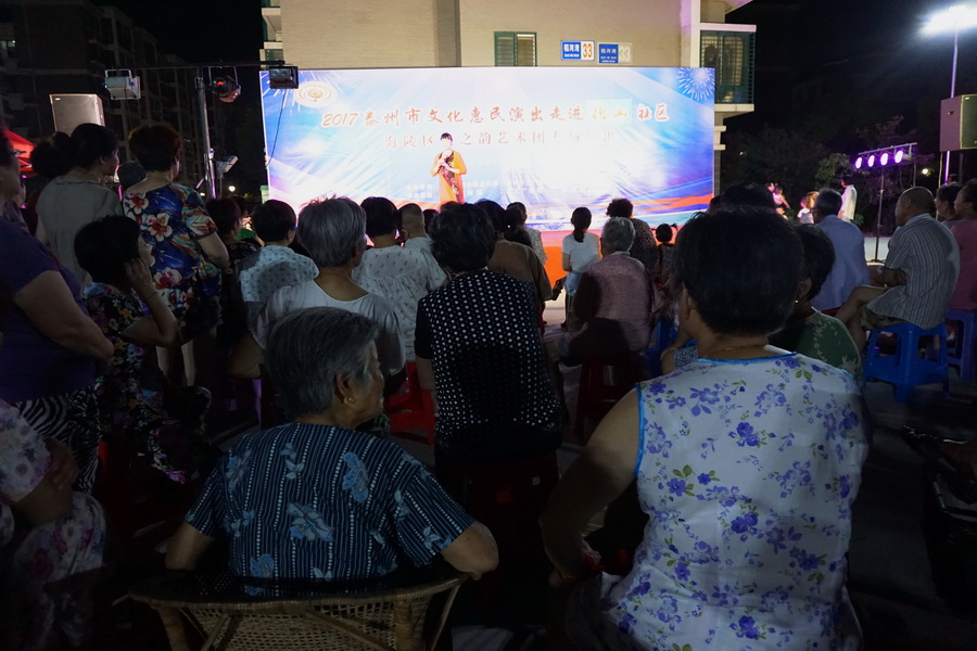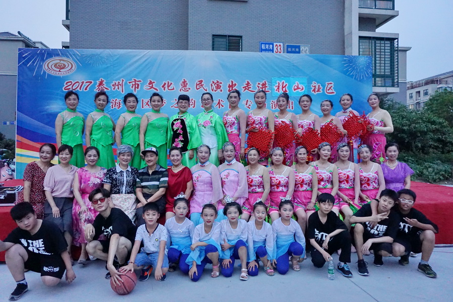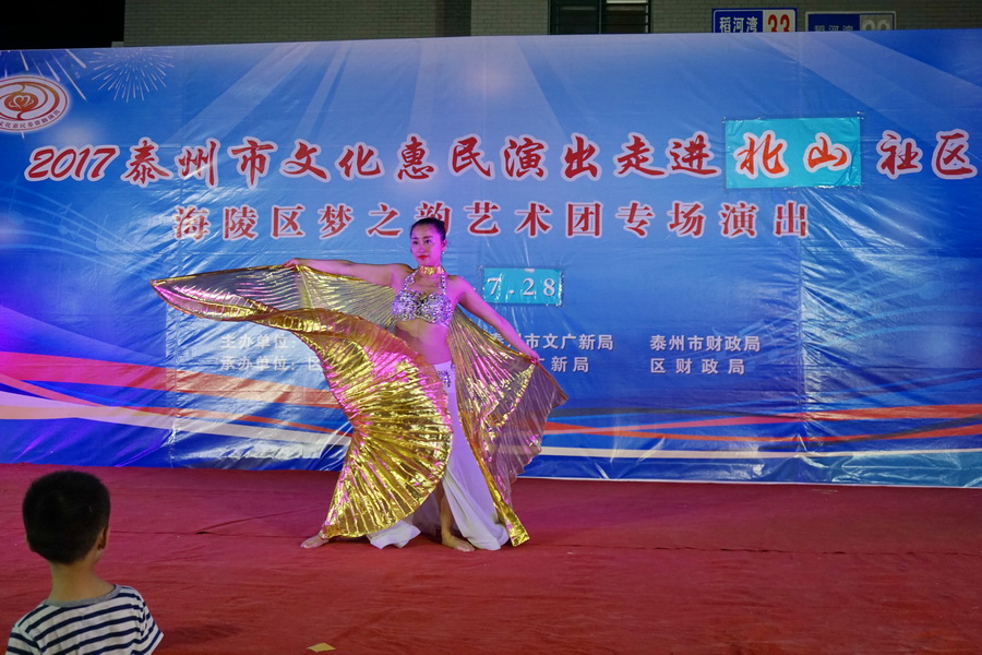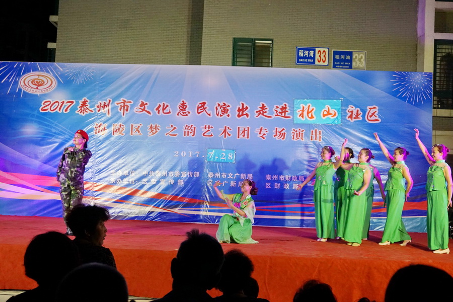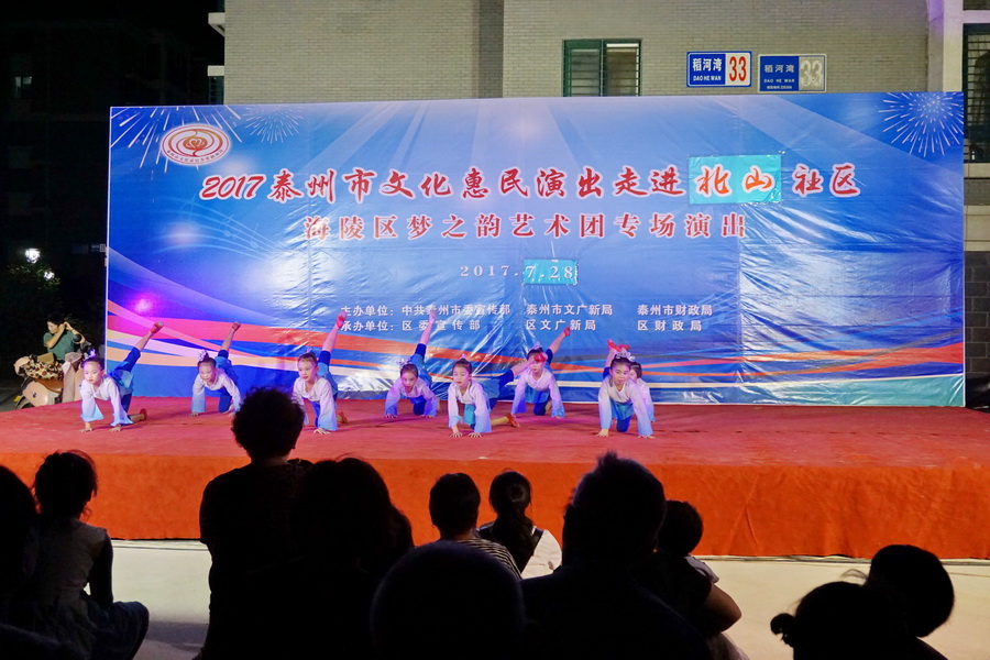 2017年7月28日傍晚,位于城北的稻河湾小区中心广场流光溢彩,歌舞升平,欢歌笑语......,应城北街道北山社区邀请,海陵区梦之韵艺术团走进北山社区,为社区居民带来一场精彩纷呈的纳凉文艺晚会。为纪念临近的八一建军90周年,新排的舞蹈《妻子》以柔美的肢体语言真情再现了军人为国家舍小家的无私奉献精神,为带给暑期的孩子们特别的问候,天真可爱的少儿舞蹈《游子吟》博得现场小观众们的欢呼雀跃.....。演出结束了,不少观众仍余兴未尽,尤其是迟来的观众连声感叹遗憾没有看到全部节目,并一再追问何时再来.....。120分钟的盛情演出,为炎炎夏日中的社区居民带来了一丝清凉和愉悦。