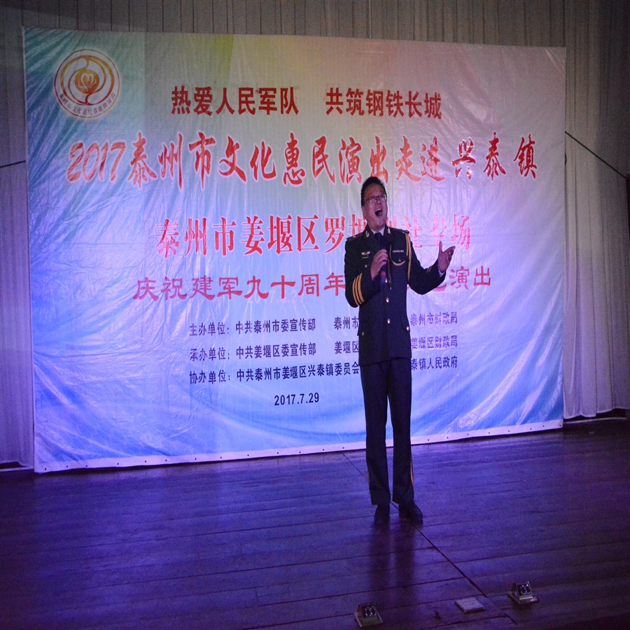 热爱人民军队,共筑钢铁长城。7月29日上午9时,由泰州市姜堰区兴泰镇党委、政府主办,姜堰区罗塘剧社协办《庆祝建军九十周年双拥文艺演出》活动,在兴泰镇政府会议厅拉开帷幕,演出前,姜堰区民政局领导到场讲话,现场播放兴泰镇双拥工作先进亊迹短片,区、镇两级领导分别为重点优抚对象、贫困优抚对象、现役军人家属代表颁发慰问金和奖品。为突出庆祝建军九十周年宣传主题,姜堰区罗塘剧社精心策划调整了14个丰富多彩的文艺节目,安排创作人员重新编写节目主持词,当天演出不仅有激情奔放的民歌与民舞,而且有耳熟能详的戏曲与小品,压台小戏淮剧《父还子债》,该剧根据笫五届感动泰州·美德善行十大人物,姜堰区张甸镇农民李开诚为死去的儿子偿还债务的真实故事创作编导,剧情生动感人,演员表演精彩,唱腔催人泪下,剧情主题突出,弘扬社会正气,倡导诚实守信,赢得了现场观众的阵阵掌声。当天演出时长120分钟,观众达到200多人,优美而精彩的表演给兴泰镇人民送去一份丰盛的文化大餐。