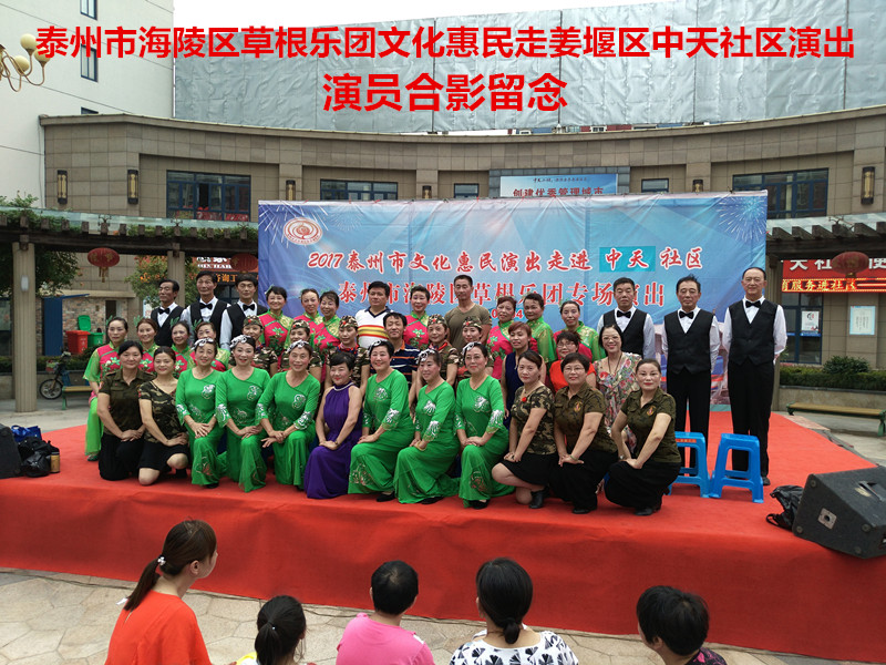 2017年8月4日烈日当空,气温高达39度,地表温度45度,如此高温住在室内的人们都要开着空调、电扇工作或生活,此时在草根乐团却有一股热情比高温天气还高,50多名演职人员从下午一点半开始整理演出用品,在中百一店公交站台集中前往姜堰区罗塘街道中天社区,举办2017泰州市文化惠民走进中天社区草根乐团专场演出!