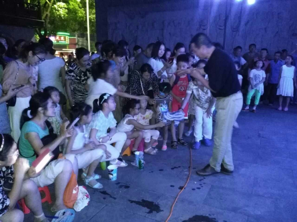 木偶剧团在许虹团长的带领下给现场居民、儿童带来了高水准的演出,表演内容主要有杖头木偶戏《快乐的小伙伴》,寓言剧《诚实的孩子》,布袋木偶戏《懒汉和苍蝇》、《新武松打虎》,现场互动,《变脸》。活动一开始就吸引了很多青少年朋友,随着音乐声的响起,顷刻间就聚集500多名老少朋友前来观赏表演,演职员的精彩表演,赢得了现场观众的阵阵掌声。最后由许虹团长表演的《变脸》节目将整场演出推向了高潮。