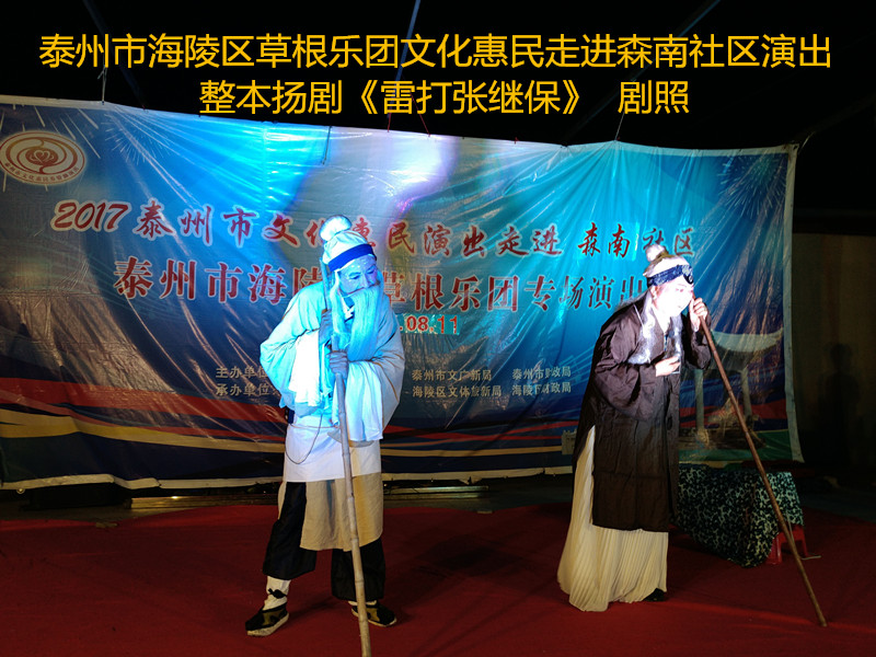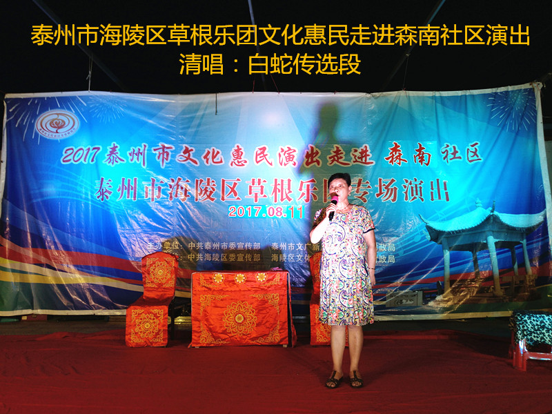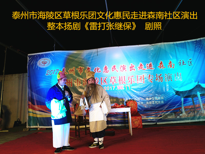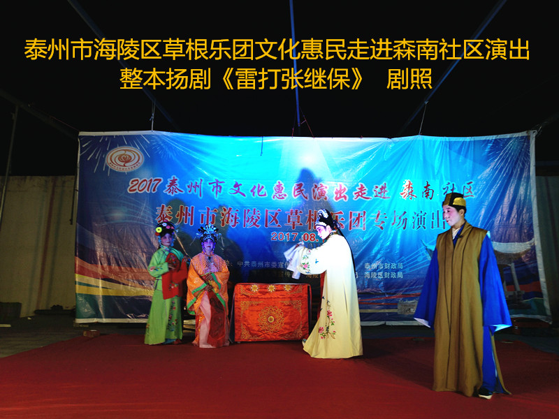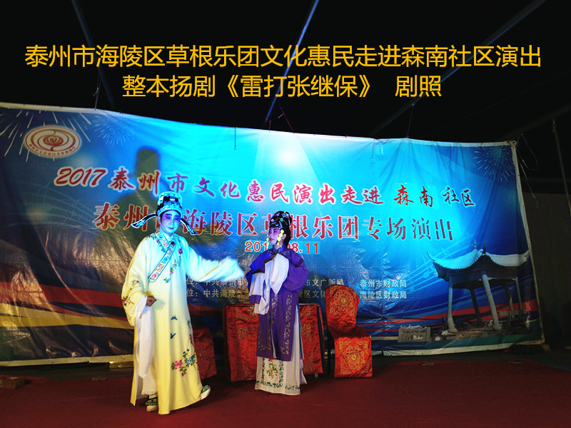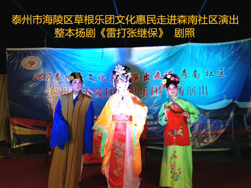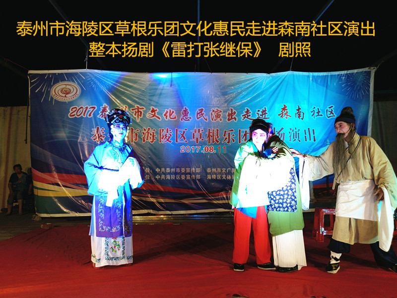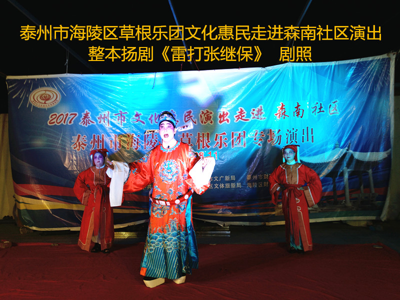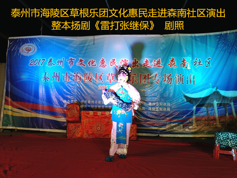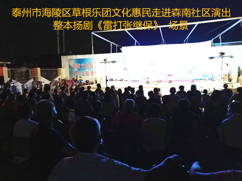 演出现场坐满观众,广场四周还站满了人,清唱了一段《白蛇传》之后,草根乐团戏曲队为社区居民演出了整本扬剧《雷打张继保》,整整三个小时的演出,全体演职人员坚守各自的岗位,尽心尽力演好每一场、做好每个动作、唱好毎一句词、奏好每一个音符。灯光音响字幕为演出效果提供了保障,草根乐团全心全意为观众服务的精神感动了观众;草根乐团的演出水平获得了社区领导和居民朋友的好评。演出过程中观众一阵阵掌声、欢呼声为演员加油!为精彩的节目喝彩!