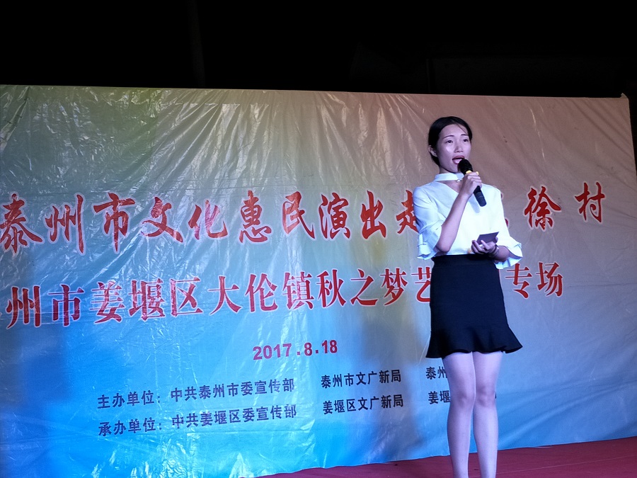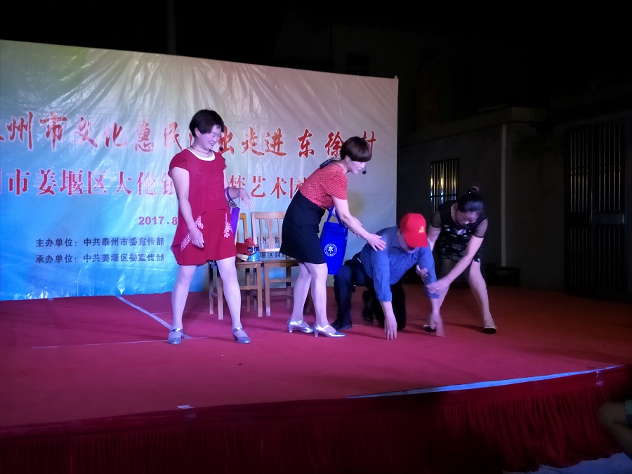 8月18日晚大伦镇秋之梦艺术团,冒着极端的天气,来到大伦镇东徐村进行惠民演出,由于村里面宣传得早,晚上7点不到,老百姓就早早地来到演出现场。惠民演出围绕文明城市创建工作的总体要求和基本内容,艺术团精心编排了十多个节目。有舞蹈,快板,独唱,京胡独奏,方言韵白,方言小品,京剧,锡剧,黄梅戏等精彩片段,演出内容丰富,节目形式多样,现场气氛热烈,观众掌声不断,活动结束后,村干部及老百姓对惠民演出给予了很好的评价和赞赏。