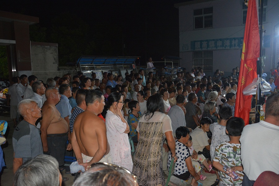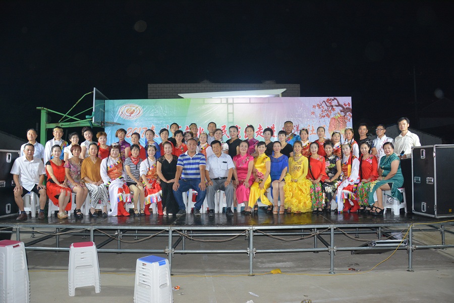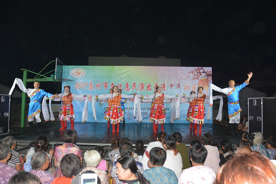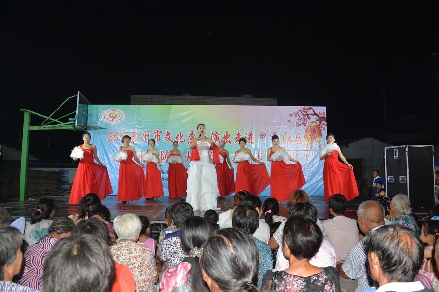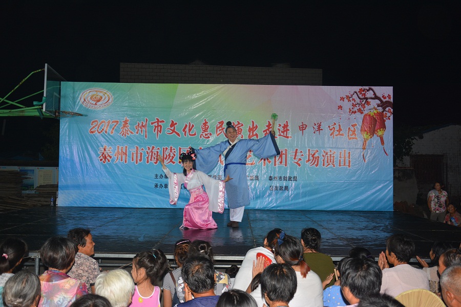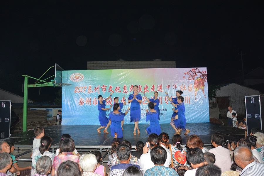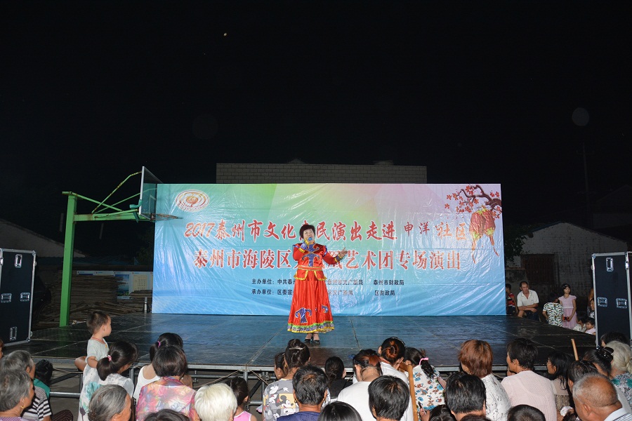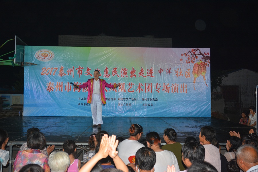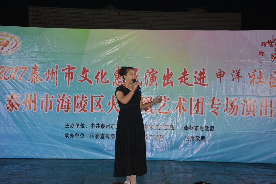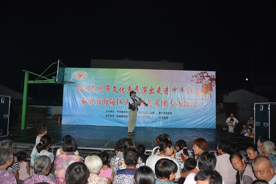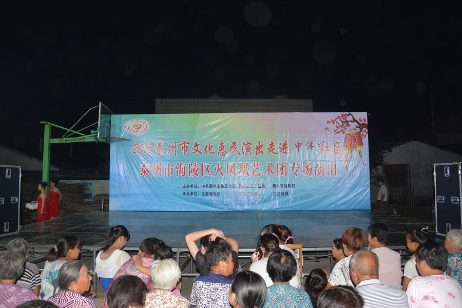 2017年8月20日,天气是阵雨或雷阵雨,不断出现强降水、雷雨大风。火凤凰艺术团面为了完成这次预定的演出任务,下午全体演职人员的克服困难,整理演出用品,准时集结到柳园,然后用了1个多小时时间,完成了近50公里的路程,走进了美丽的姜堰区顾高镇申洋村。因为顾高镇申洋村宣传到位,村民几天前就知道火凤凰艺术团晚上来演出,舞台搭好后,舞台前坐满观众,四周还站满了人。一切准备就绪,7点30分,演出准点开始。演出受到了顾高镇申洋村居民们的热情洋溢的喝彩。火凤凰艺术团经过精心准备16个精彩节目逐个呈现给观众时,中间还临时增加了魔术、独唱、葫芦丝与口琴合奏3个节目,演出中间,顾高镇申洋村社区领导登台为演员献花,小朋友还登台参与节目互动,现场演出热闹无比、掌声不断,整场演出圆满成功。