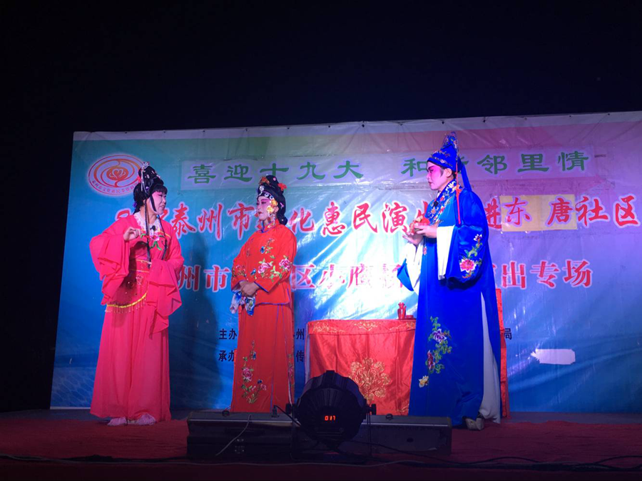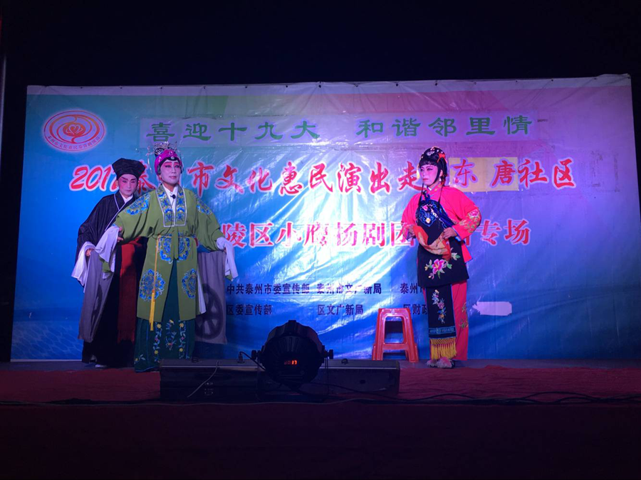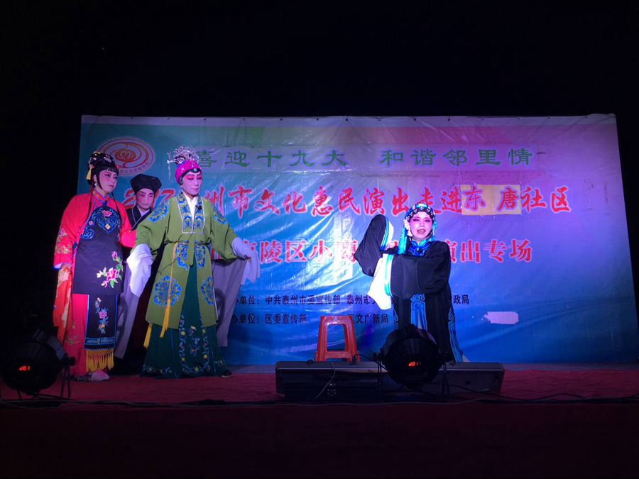2017泰州市文化惠民演出走进海陵区京泰街道东唐社区,海陵区小鹰扬剧团专场演出,2017年8月13日晚上在海陵区京泰街道东唐十二组停车场成功举办。经典的扬剧折子戏博得了观众的阵阵掌声。演出很成功!感谢社区领导提供全方位的服务!