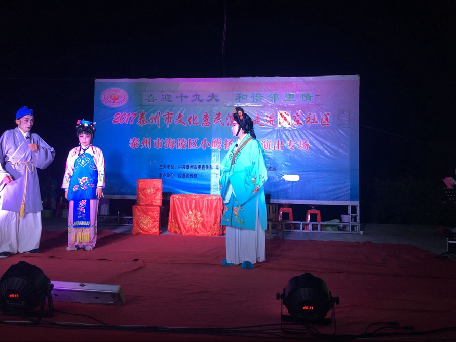 2017泰州市文化惠民演出走进海陵区苏陈镇院庄村,海陵区小鹰扬剧团专场演出,2017年8月23日晚上在海陵区苏陈镇院庄村文化广场社成功举办。本次演出演出剧目为折子戏《赠珠塔》-赠塔,《小媳妇回娘家》、《安寿宝卖身》-母子离别。经典的扬剧折子戏博得了观众的阵阵掌声。演出很成功!感谢社区领导提供全方位的服务!