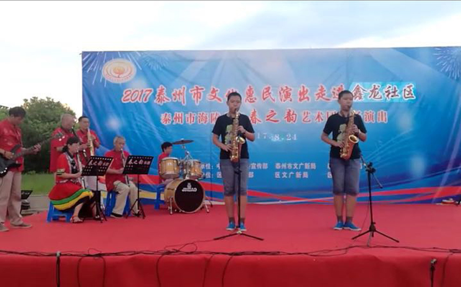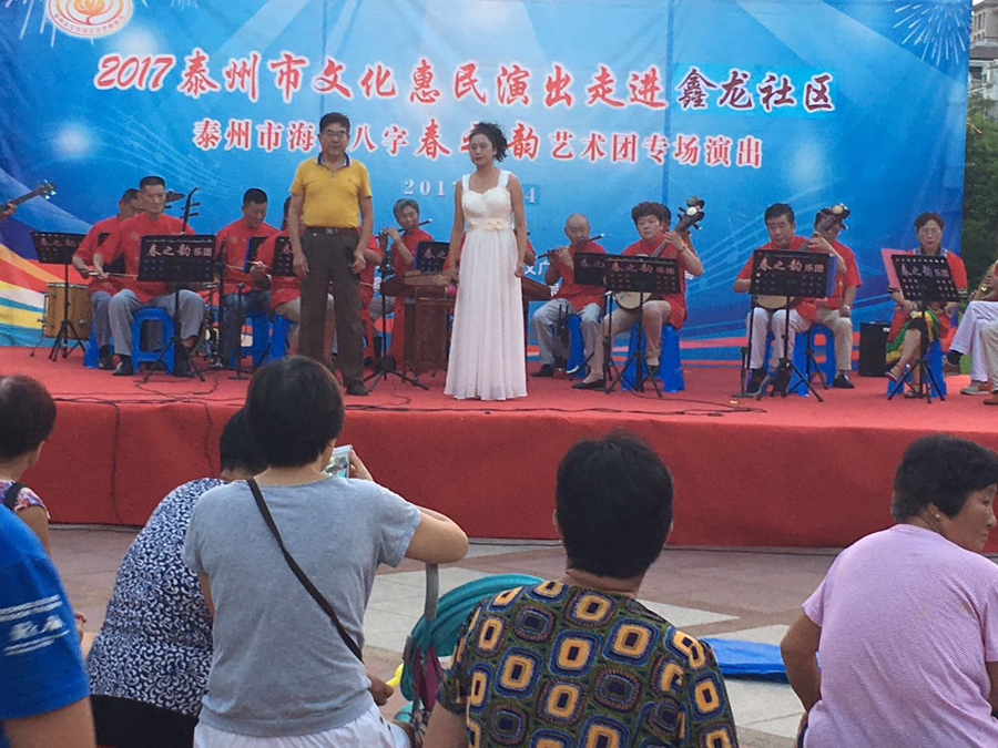 海陵春之韵艺术团走进城南街道鑫龙社区,8月24日下午四时,春之韵艺术团在鑫龙社区中心广场惠民演出。二十人的乐队,中西合璧,奏出江南丝竹的优美的电声管乐的气势。一百多名观众欣赏了器乐合奏、独奏、歌曲、戏曲和舞蹈。表演者充分展示才气,观众兴高采烈。最后,全场互动高歌(我们走在大路上),整台演出90多分钟,在欢呼和掌声中结束。