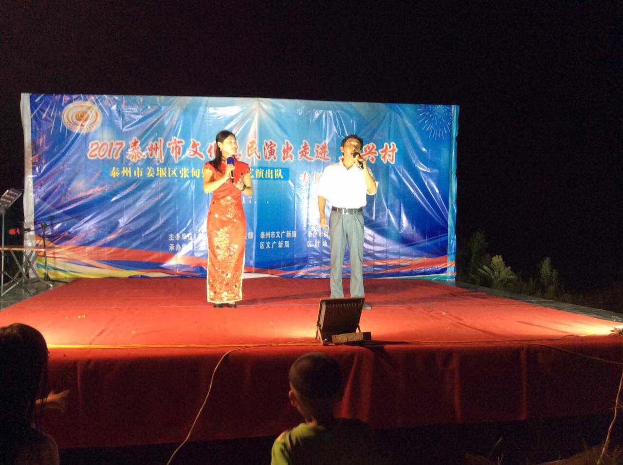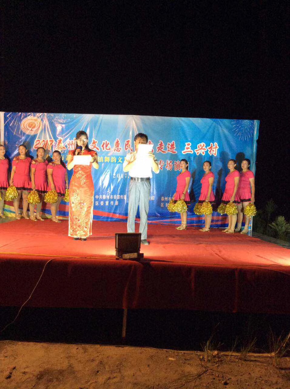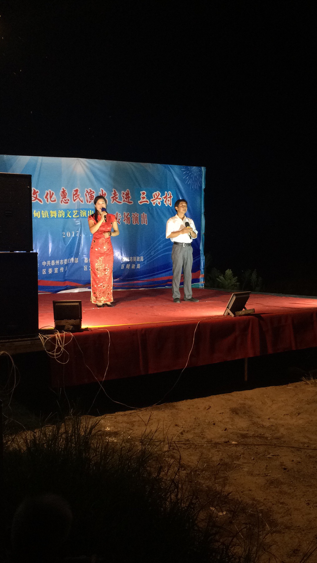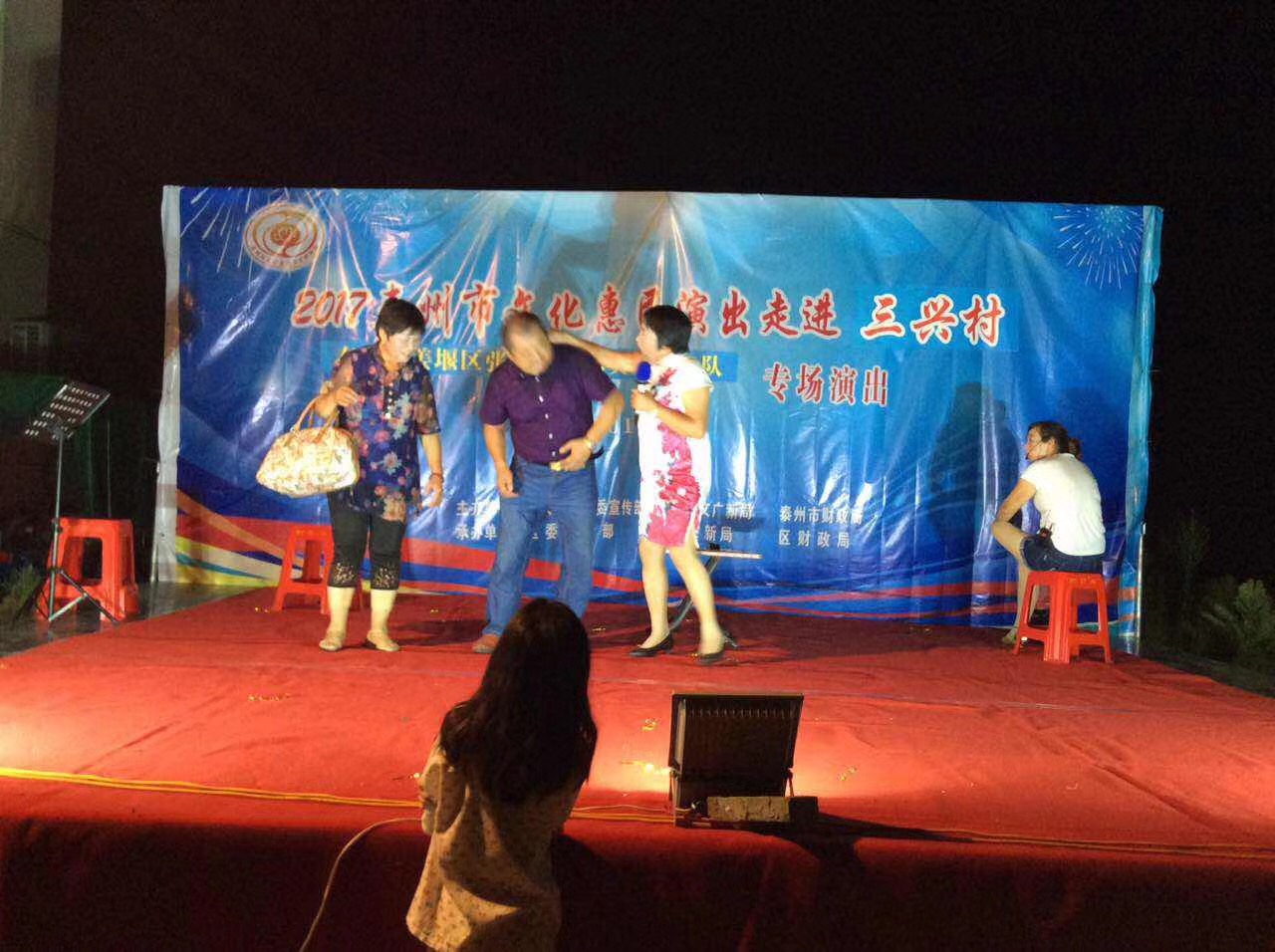 2017年8.28日晚在姜堰区张甸镇三兴村演出,演出地点在三兴村村部,虽然村部是才建起来的,门口长了一地的草,但是村民朋友们都早早的搬着凳子坐在周围的路旁等候观看,大家对于演出的节目表示很好,特别是小品《有钱就是妈》对于农村的一些媳妇有很好的教育意义,让大家知道要孝敬长辈,不管长辈有钱没钱都要保持一样的心态去对待他(她)们,节目中的媳妇把角色的扮演的很到位,有钱和没钱的前后对比相差很大,把现场的气氛一波波带向高潮。