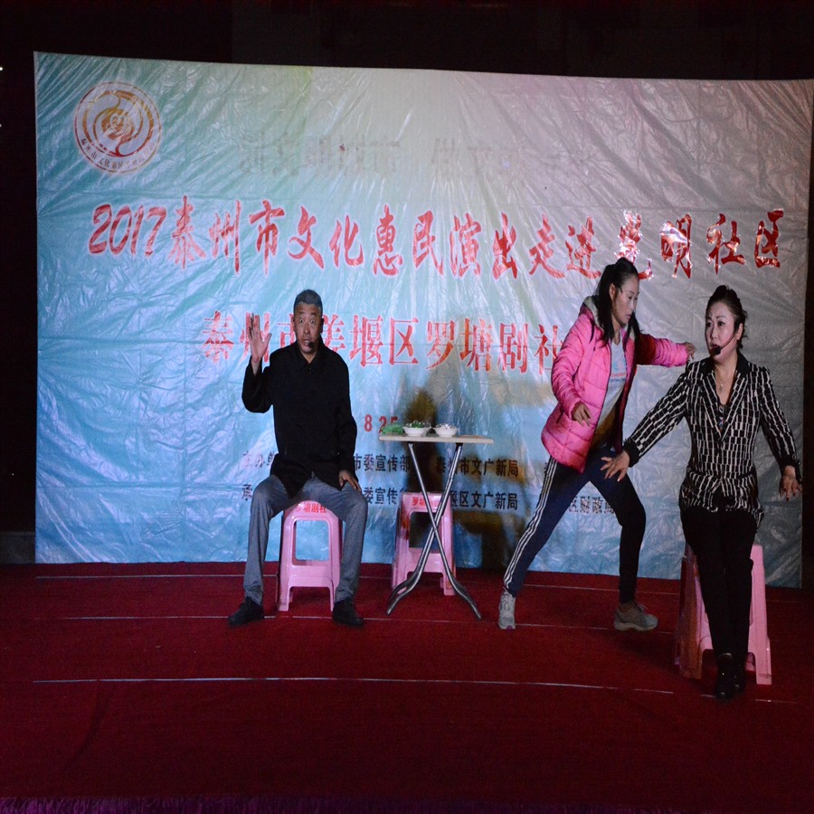 8月25日,姜堰区罗塘剧社应罗塘街道光明社区邀请,2017年泰州市文化惠民券专场演出于当晚7点,在锦都国际花园文化广场上演。为适应观众不同层次的文化欣赏需求,姜堰区罗塘剧社精心策划了16个丰富多彩的文艺节目,随着欢快喜庆的音乐响起,舞蹈《张灯结彩》拉开了演出序幕,当晚演出不仅有激情奔放的民歌与民舞,而且有耳熟能详的戏曲与小品,压台小戏淮剧《父还子债》,该剧是根据笫五届感动泰州·美德善行十大人物,姜堰区张甸镇农民李开诚为死去的儿子偿还欠债的真实故事创作而编导,剧情生动感人,演员入情入戏,唱腔催人泪下,整台演出效果,弘扬社会正气,倡导诚实守信,气氛热烈,掌声不断,赢得了广大观众的一致好评。当天晚上演出时长120分钟,观众达到300多人,优美而精彩的表演,给光明社区居民送去一份丰盛的文化大餐。