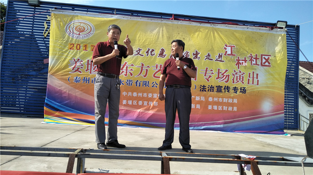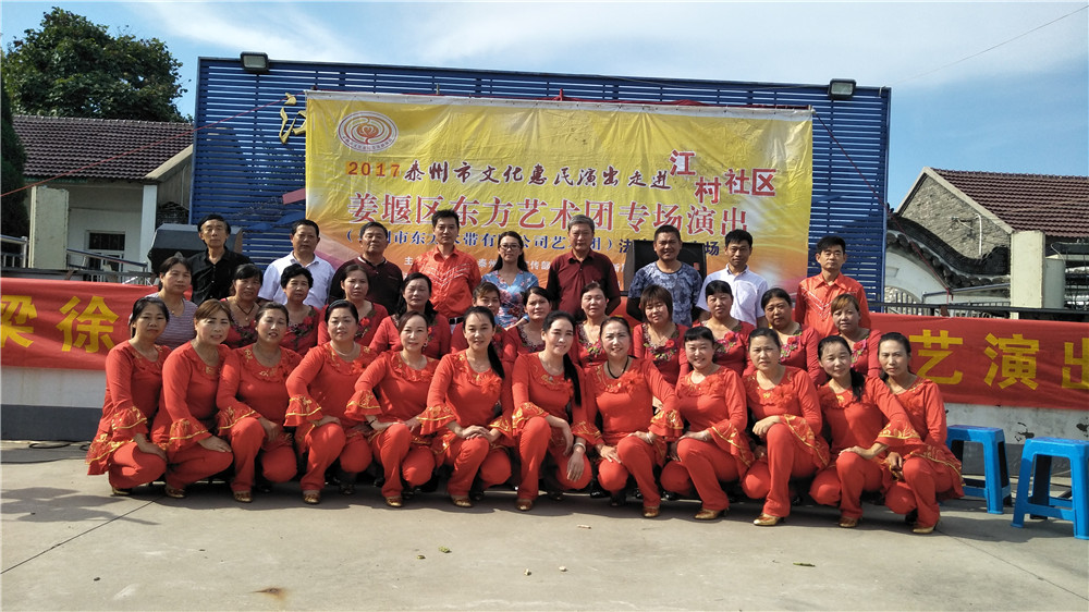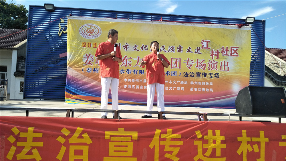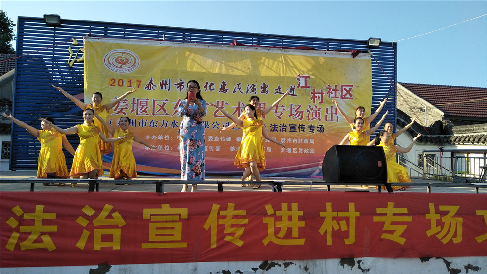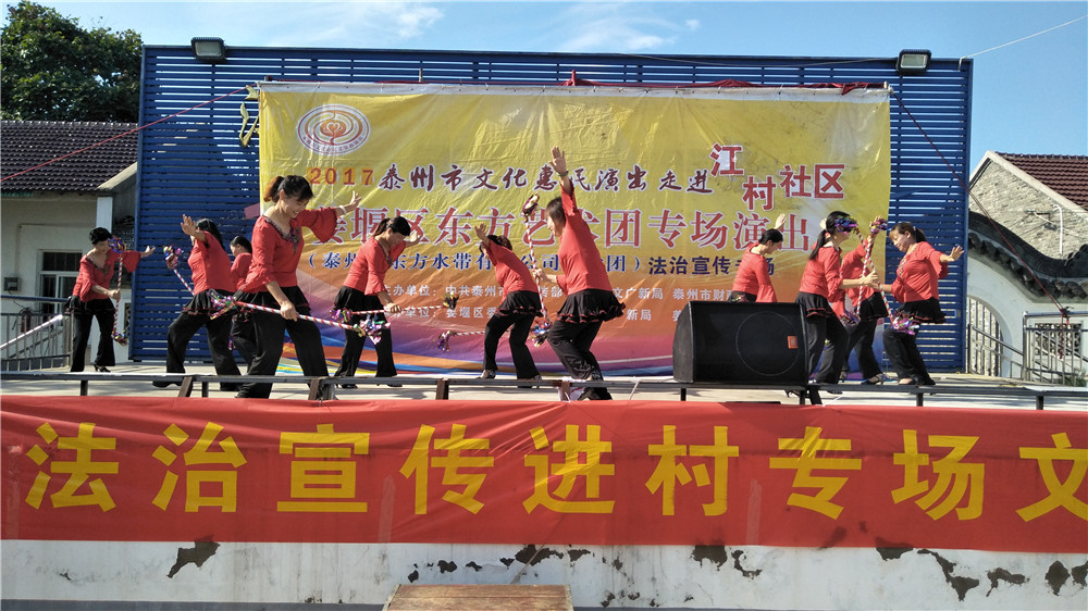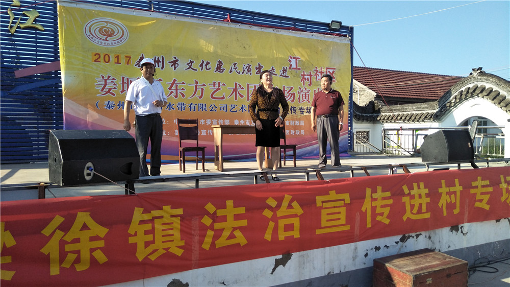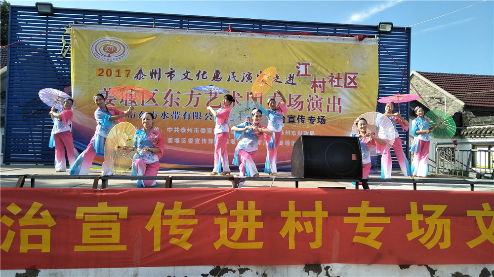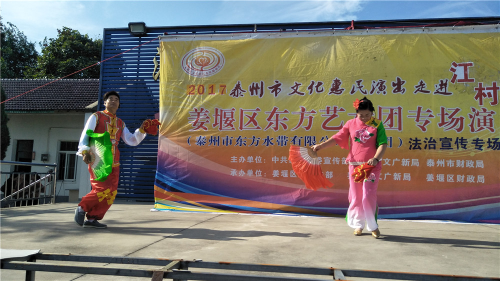 9月1日下午,姜堰区东方艺术团走进梁徐镇江村村,为百姓们带去了精彩纷呈的文艺演出。歌舞《微笑》、歌曲《万水千山总是情》、莲湘舞《红红的中国》、小品《如此媒人》、方言韵白《斗嘴》等精彩节目赢得了观众们的阵阵掌声。