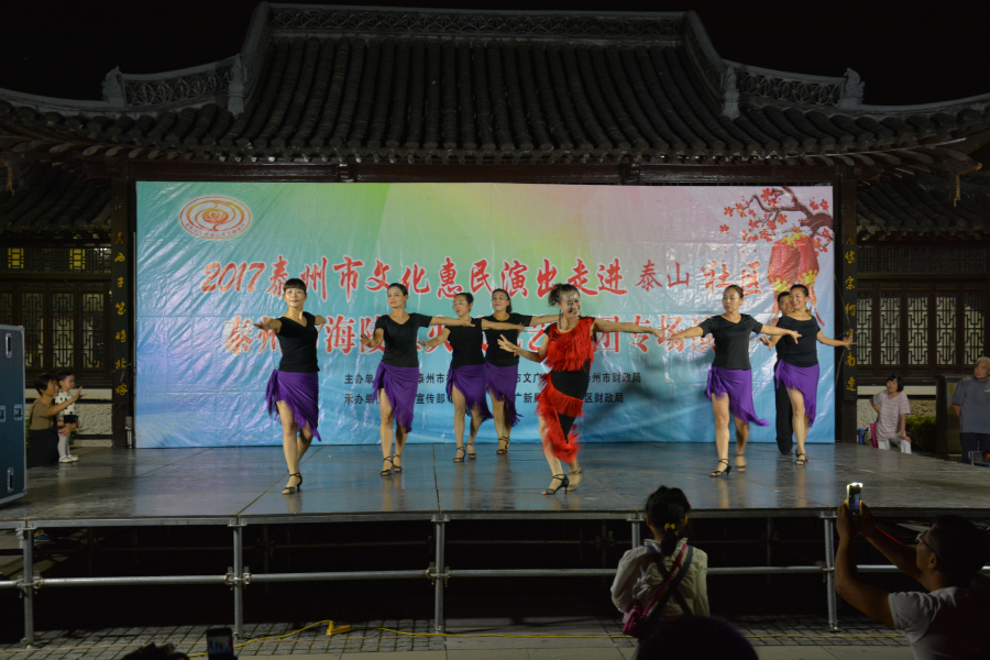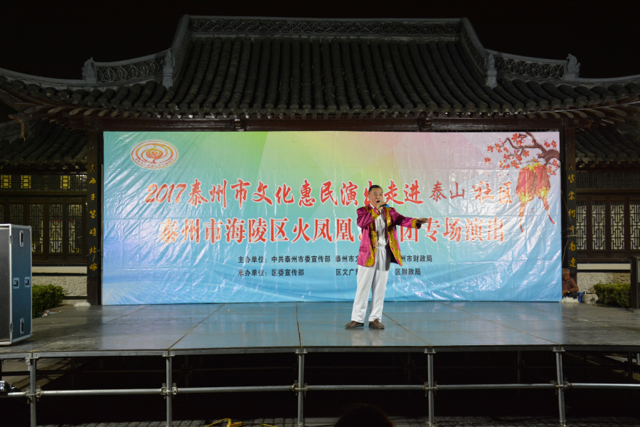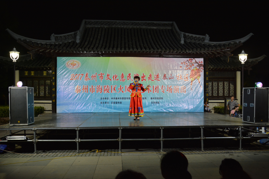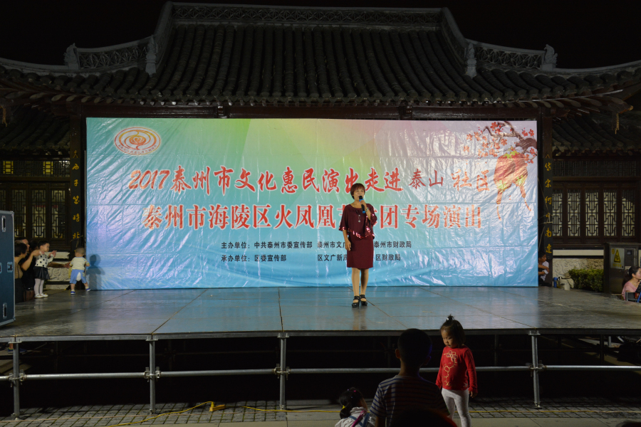 为丰富村民群众的文化生活,营造良好的文化活动氛围,传递文化正能量,2017年9月5日,应海陵区城中街道泰山社区邀请,火凤凰艺术团文化惠民演出走进了泰山社区。演出现场人声鼎沸,火凤凰艺术团文化惠民演出在泰山公园东门拉开帷幕,几百名居民在家门口享受了一场欢乐的文化盛宴。近二个小时的演出,获奖节目《水乡泰州美》、经典的动感《傲慢华尔兹》《黄玫瑰》《路遇》《心中的舞蹈》和传统的《洞房花烛静幽幽》《天女散花》《手心手背都是肉》《白毛女》深深地抓住了在场所有观众的目光,独唱《呼伦贝尔大草原》《北京颂歌》和精彩的舞蹈《燃烧地板》《蝶舞凤飞 》《难忘今宵 》与感人的诗歌朗诵《母亲 》一一登台亮相。演员们塑造的人物鲜活灵动,观众们不时地拿起手机拍照,为演员的精彩表演鼓掌叫好。观众对演出赞不绝口:“火凤凰艺术团这些节目就是演得好啊!看了这么多精彩的节目,让我们感到特别满足和开心!”