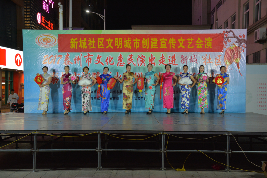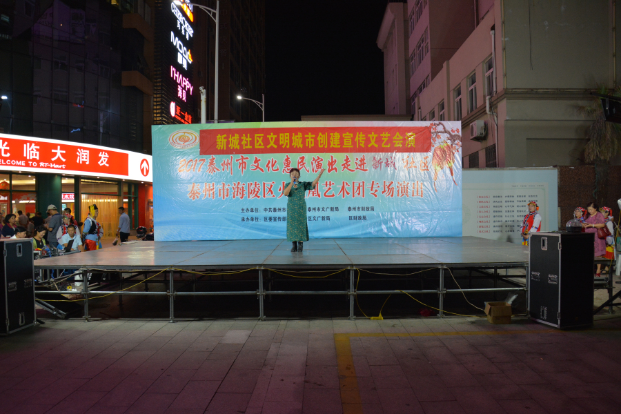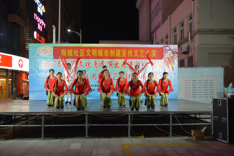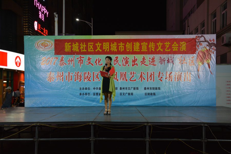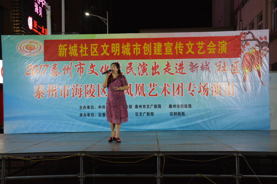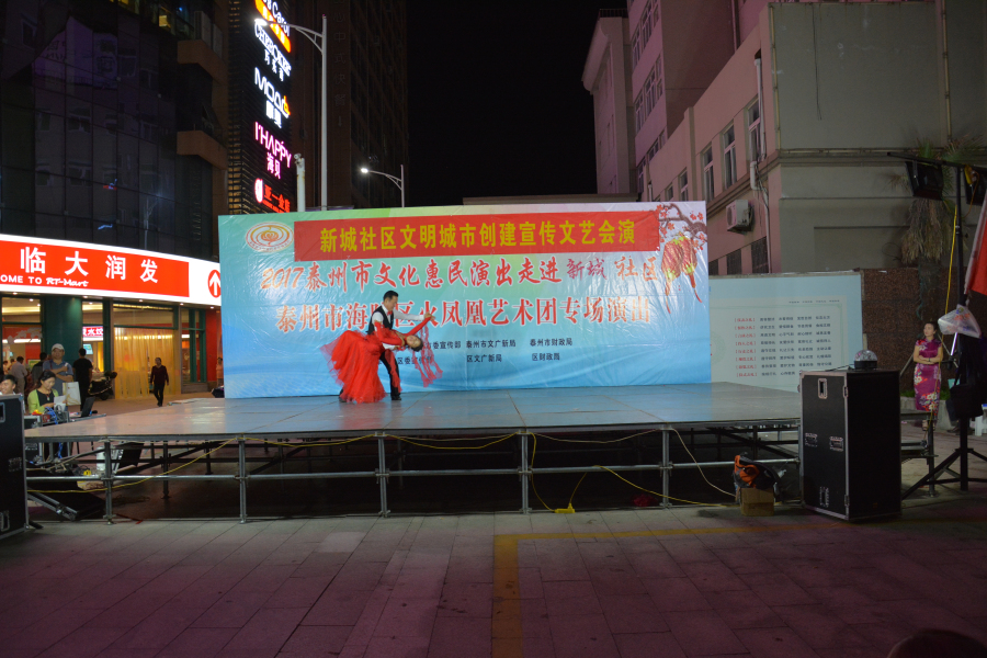 应高港区口岸街道新城社区邀请,傍晚17时,火凤凰艺术团文化惠民演出队员准时从四面八方集结至柳园西停车场,大家井然有序乘上大巴车,行驰30多公里赶到演出现场后,团员们一下车就立即开始化妆、走台、对词。这是一个美丽的社区,成立于2004年10月。辖区东至扬子江南路,西至金港中路,南至通扬路,北至通港路,面积约0.98平方公里,有12个居民小区,住户近2300户,人口近7000人,是高港区人民政府所在地。先后荣获“全国敬老模范社区”、“江苏省和谐示范社区”、“江苏省绿色环保社区”、“江苏省充分再就业社区”、“江苏省科普社区”、“泰州市文明社区标兵”等光荣称号。晚上19时,依恋着美丽的夜景,演出场地灯光灿烂,文化惠民演出拉开序幕,现场观众不时地拿起手机拍照,为演员的精彩表演鼓掌叫好……演出中高港区空竹协会也借机登台表演节目,美丽的社区呈现了美好的夜晚。整场演出圆满结束。