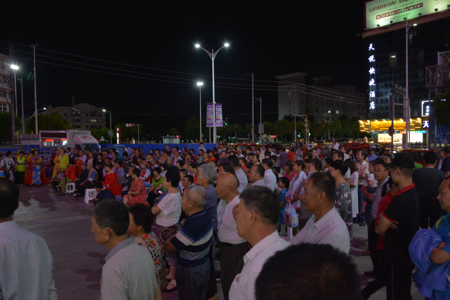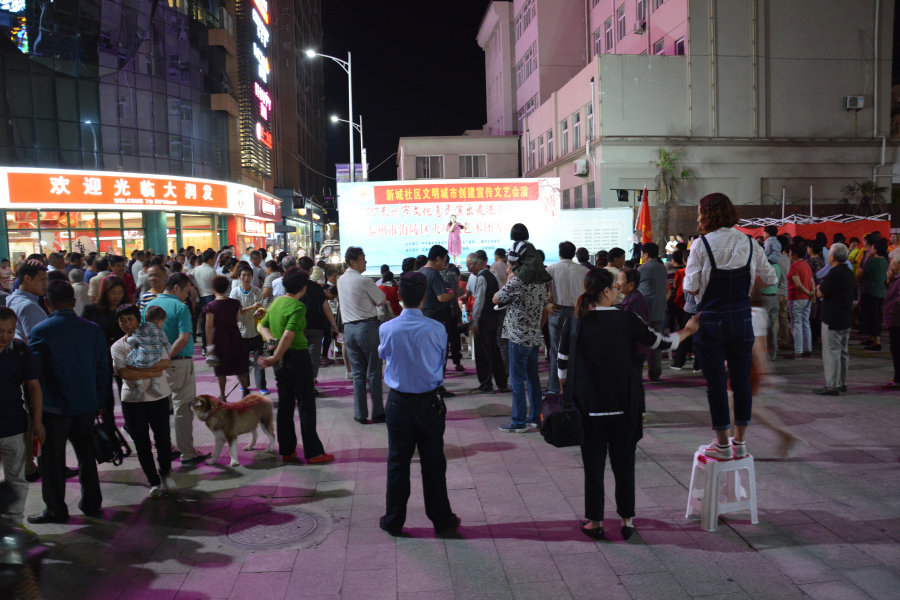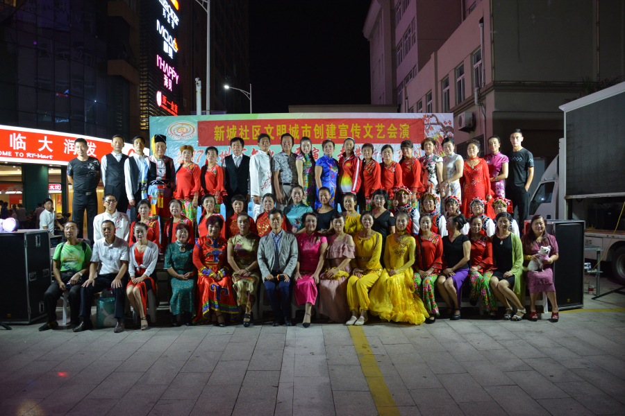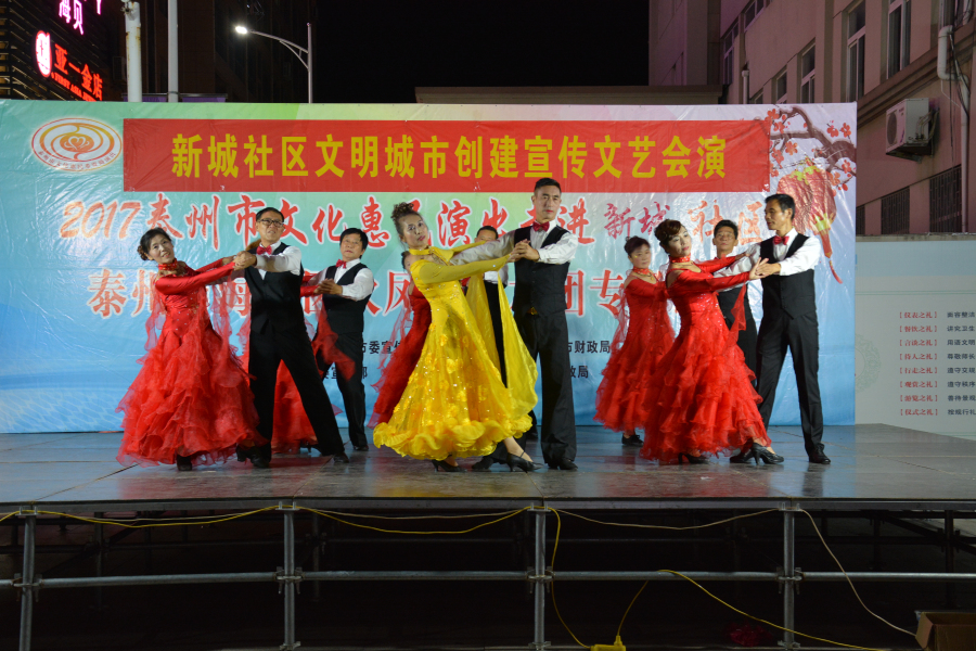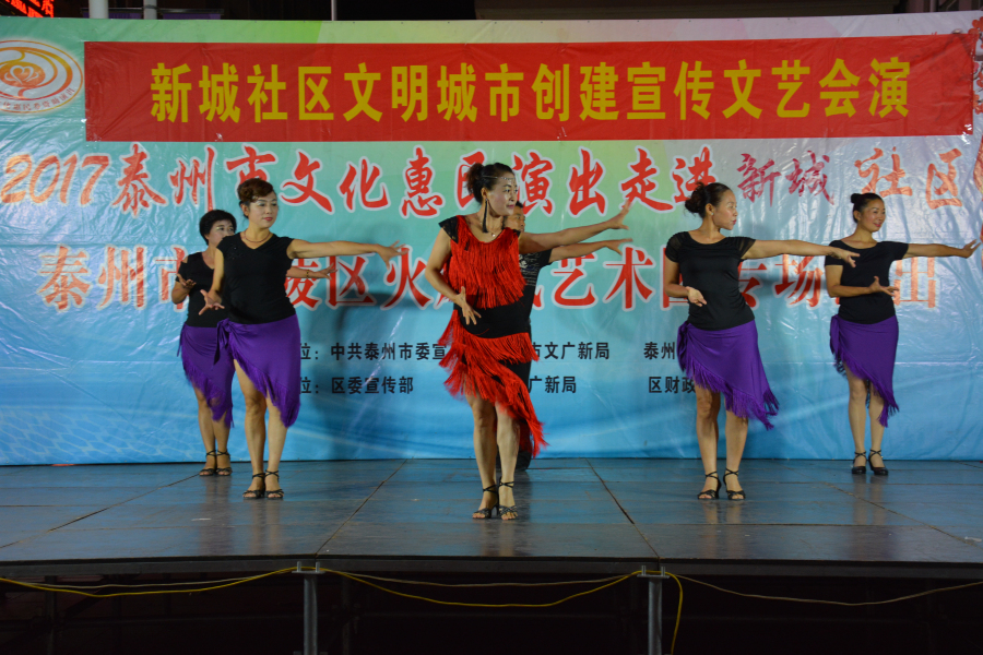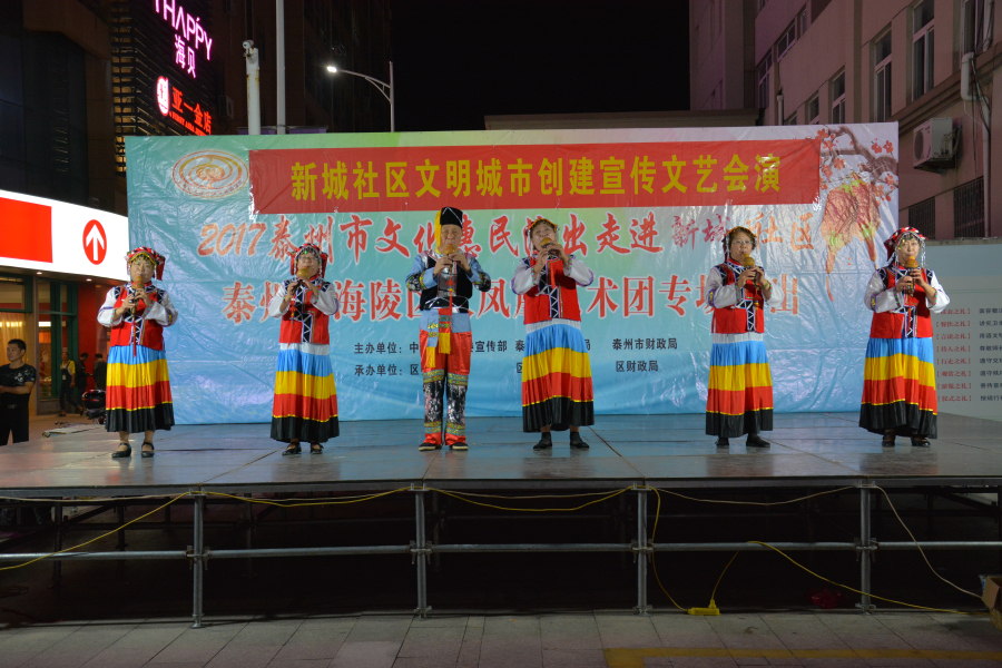 应高港区口岸街道新城社区邀请,傍晚17时,火凤凰艺术团文化惠民演出队员准时从四面八方集结至柳园西停车场,大家井然有序乘上大巴车,行驰30多公里赶到演出现场后,团员们一下车就立即开始化妆、走台、对词。这是一个美丽的社区,成立于2004年10月。辖区东至扬子江南路,西至金港中路,南至通扬路,北至通港路,面积约0.98平方公里,有12个居民小区,住户近2300户,人口近7000人,是高港区人民政府所在地。先后荣获“全国敬老模范社区”、“江苏省和谐示范社区”、“江苏省绿色环保社区”、“江苏省充分再就业社区”、“江苏省科普社区”、“泰州市文明社区标兵”等光荣称号。晚上19时,依恋着美丽的夜景,演出场地灯光灿烂,文化惠民演出拉开序幕,现场观众不时地拿起手机拍照,为演员的精彩表演鼓掌叫好……演出中高港区空竹协会也借机登台表演节目,美丽的社区呈现了美好的夜晚。整场演出圆满结束。