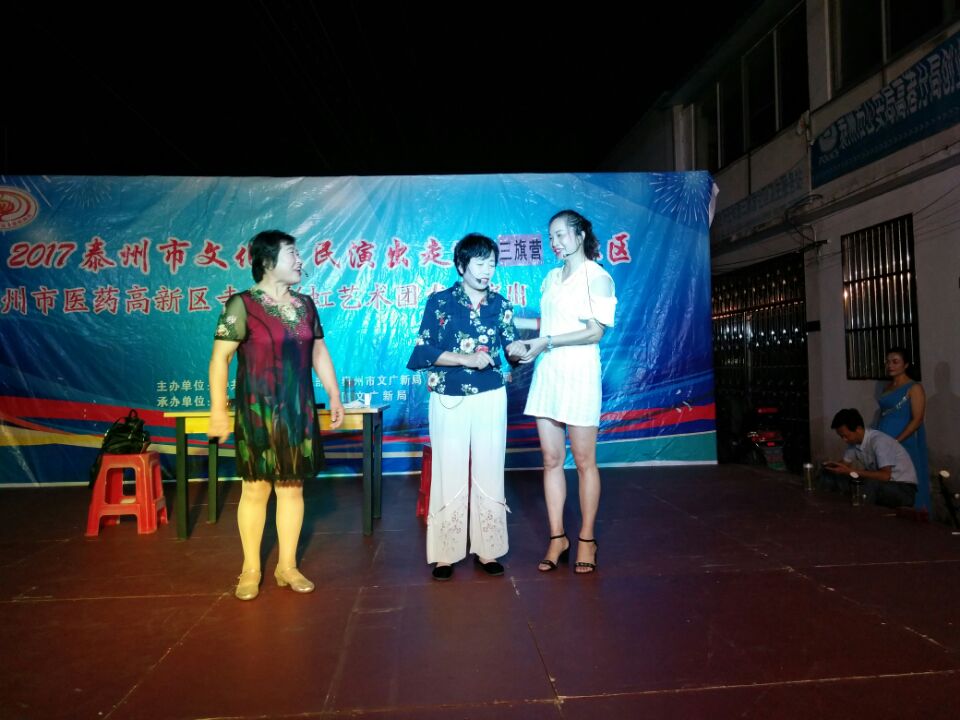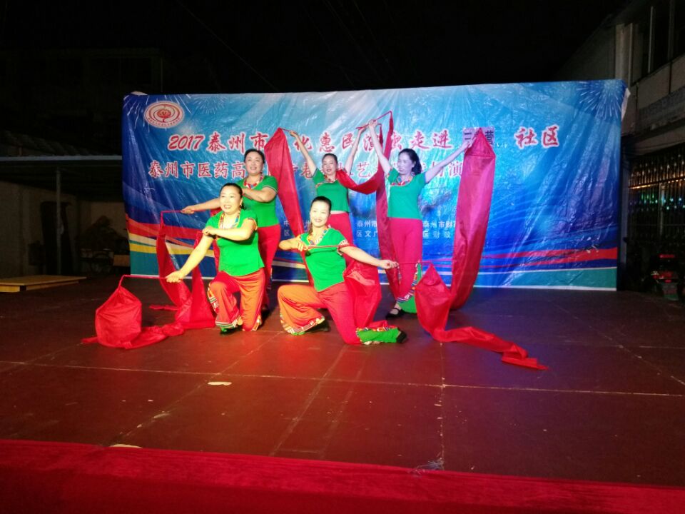 8月18日寺巷彩虹艺术团文化惠民专场演出走进高港许庄三旗营社区。晚上7点半在三旗营社区广场准时开始,现场表演节目由《开门红》拉开序幕,紧接着是女生独唱、舞蹈 、表演说唱《赞家乡》小品、戏曲选段 等等,精彩的节目一个接一个,观众们掌声、喝彩声不断,寺巷彩虹艺术团演员们的精湛表演让居民们大开眼界,更让他们陶醉在优美的旋律中和欢快的舞步中,最后在《难忘今宵》中结束这场演出,得到大家的一致好评。