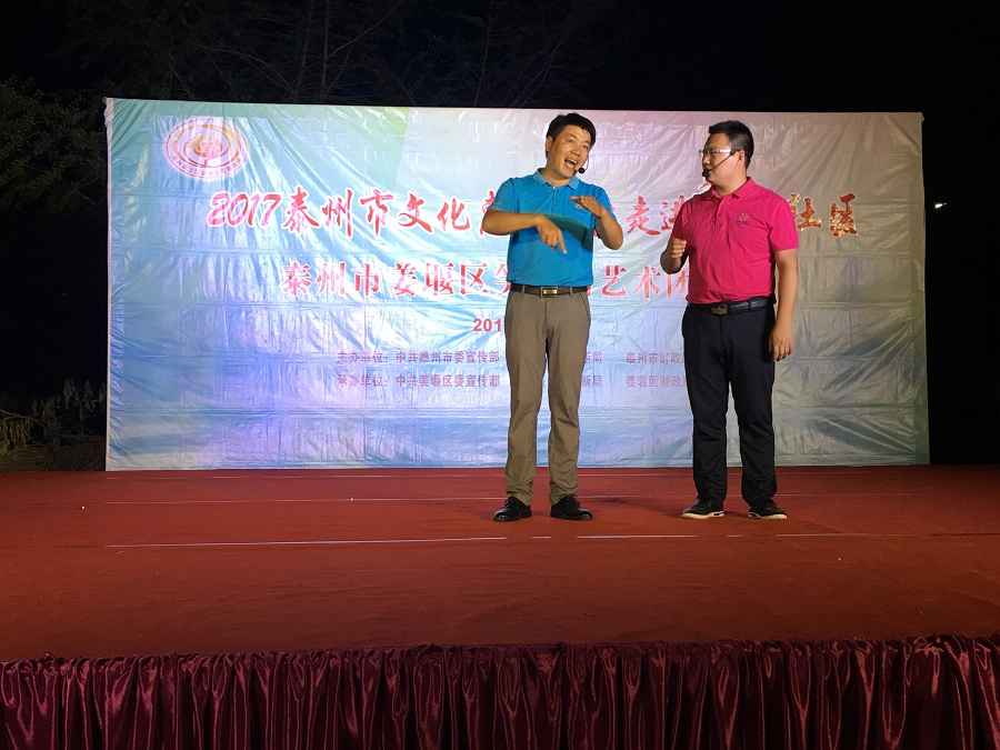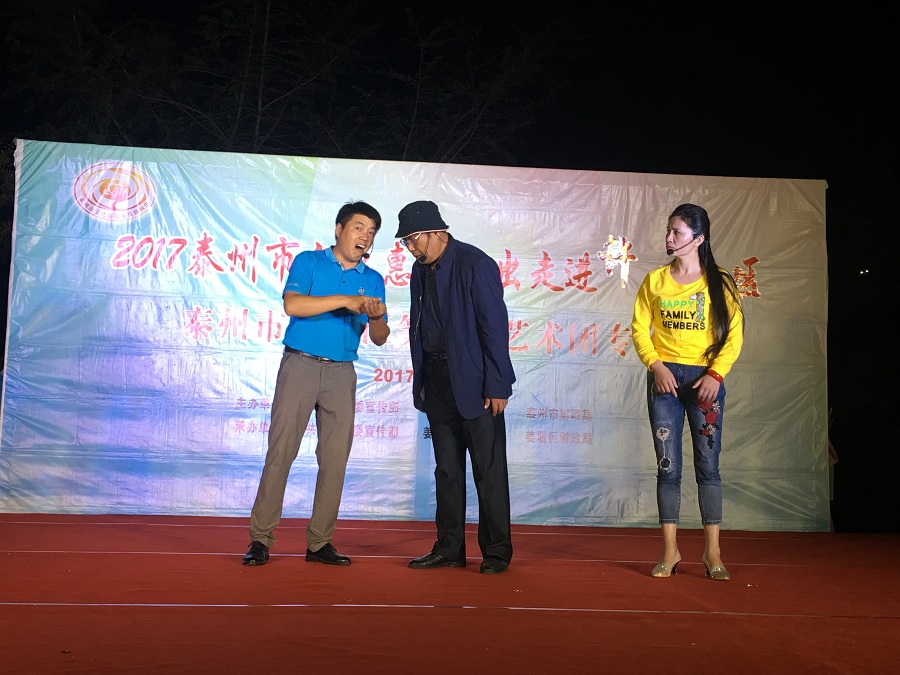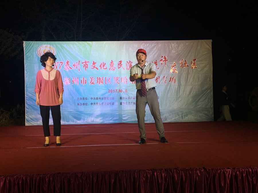10月8日,姜堰区笑哈哈艺术团文化惠民专场演出走进许庄社区。晚上7点演出在许庄社区准时开始,现场表演的节目有舞蹈《红红火火大中华》、莲花落说唱《莲花一打笑哈哈》、方言韵白《路在脚下》情景剧《老娘舅》萨克斯演奏《北国之春》、表演《回娘家》、天津快板《有话好好说》、相声《趣说泰州话》、表演唱《财政惠民乐农家》、以及独唱等11种形式、12个节目。整台演出时长115分钟,观众约1000人左右。节目形式多样、内容丰富,尤其相声、快板、喜剧小品、方言韵白等语言类特色节目赢得了观众的阵阵笑声和掌声,受到社区干部、群众的一致好评。