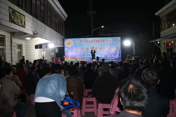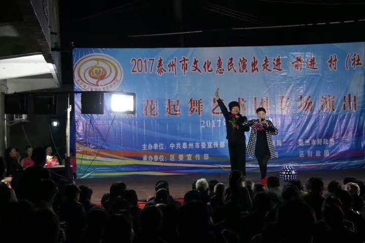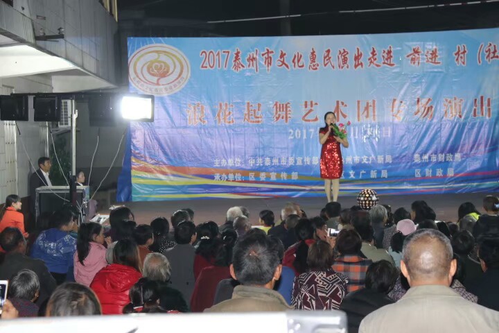 泰州医药高新区浪花起舞艺术团于2017年10月21日晚19:00走进前进社区进行文化惠民演出。为了适应观众不同层次的文化欣赏需求,我团精心策划了17个丰富多彩的文艺节目,随着欢快喜庆的音乐响起,舞蹈《张灯结彩》拉开了序幕,节目有舞蹈、快板、说唱表演、越剧、黄梅戏等形式多样、内容丰富的节目吸引了社区近四百名群众前来观看,给我们演员献花!演出赢得了观众们的阵阵掌声和笑声,受到广大干群的一致好评!