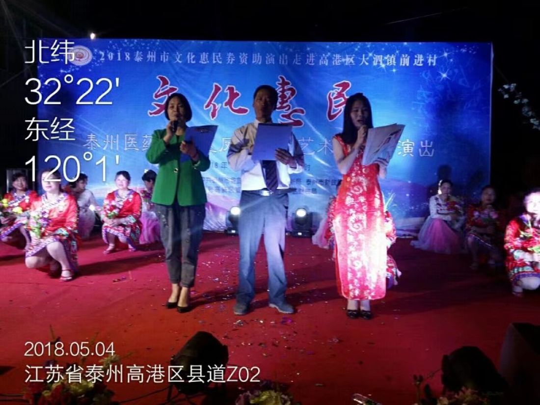 2018年5月4日晚,泰州医药高新区凤凰街道农民艺术团应邀来到了高港区大泗镇前进社区演出,演出当晚气氛火爆,舞台上载歌载舞,一个又一个精彩的节目在舞台上呈现,现场有歌曲、舞蹈、川剧变脸、小品等节目。台下观众看的如痴如醉,流连忘返。