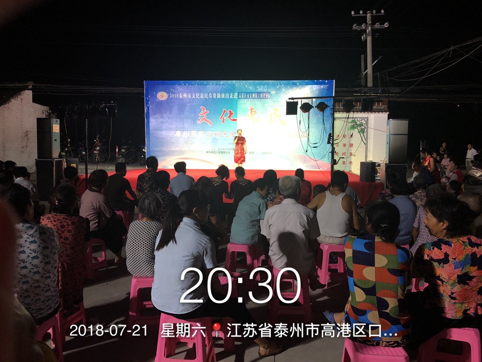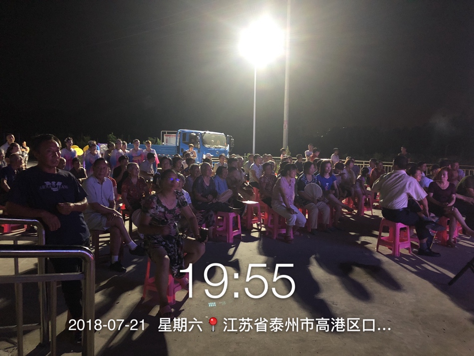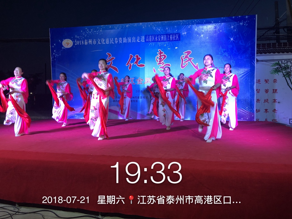 2018.7.21日,晚上天气凉爽,高港区永安洲镇上桥街道社区文化广场热闹非凡,近300多观众观看了高新区金凤凰艺术团的惠民演出,演员们热情高涨,观众们掌声不断,现场气氛非常热烈。大家都说,惠民政策好,百姓得实惠,感谢政府对惠民工程的关心支持。