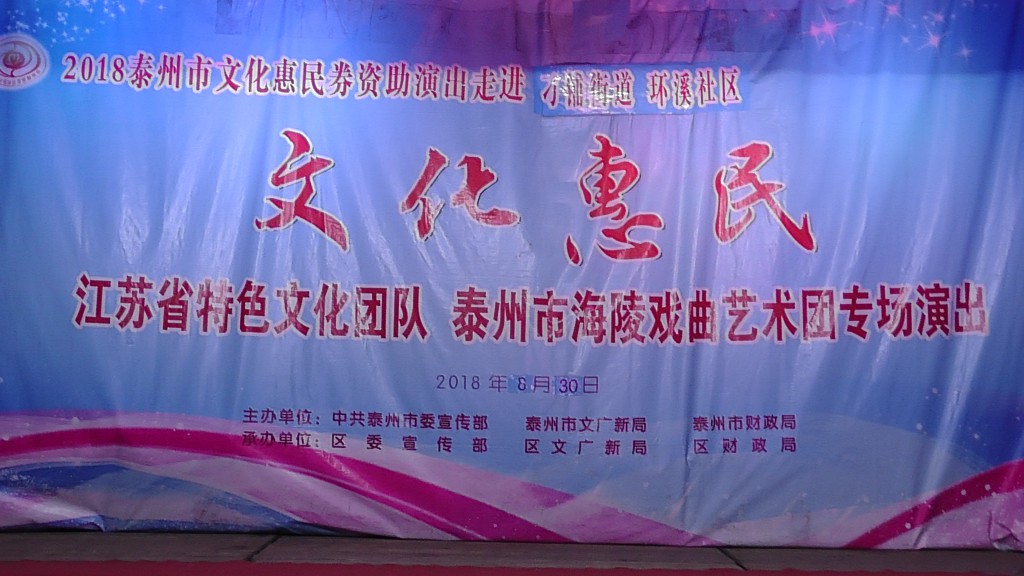 江苏省特色文化团队泰州市海陵戏曲艺术团23人,于2018年8月30日晚上7点30分在高港区刁铺街道环溪社区文化广场演出。演出大型优秀传统扬剧夜明珠,讲述了太湖之滨年届古稀的赵氏,有二个亲生儿子和一个养女,按理当享天伦之乐,感受五彩人生。只因家有一颗无价之宝夜明珠,为此原本不睦之家,倍生祸根,骨肉成仇。一场如何对待赡养老人的矛盾尖锐激烈,良心、人格受到了血与泪的考验,付出了沉重的代价。在风雨人生路上,历尽磨难的赵氏母女悲愤交加,拦路告状。不料,巡按大人的决断出人意外,夜明珠的归属悬念叠起,孽子的结果发人深省,母女俩与巡按的关系催人泪下。该剧鞭挞孽子丑恶,讴歌人间真情。“金钱是杆秤,衡量人品行,花美靠色人美凭心,仁义值千金”。观后给人启迪:人类比金钱更有价值的是纯真的道德和品格。