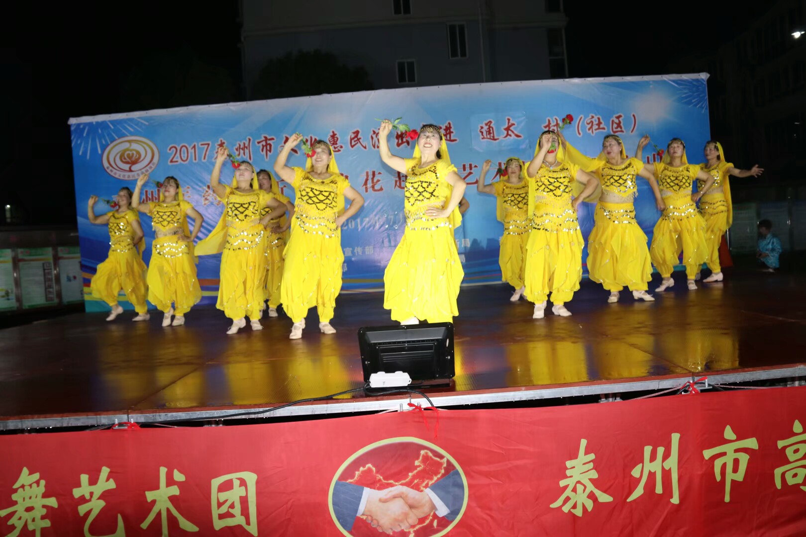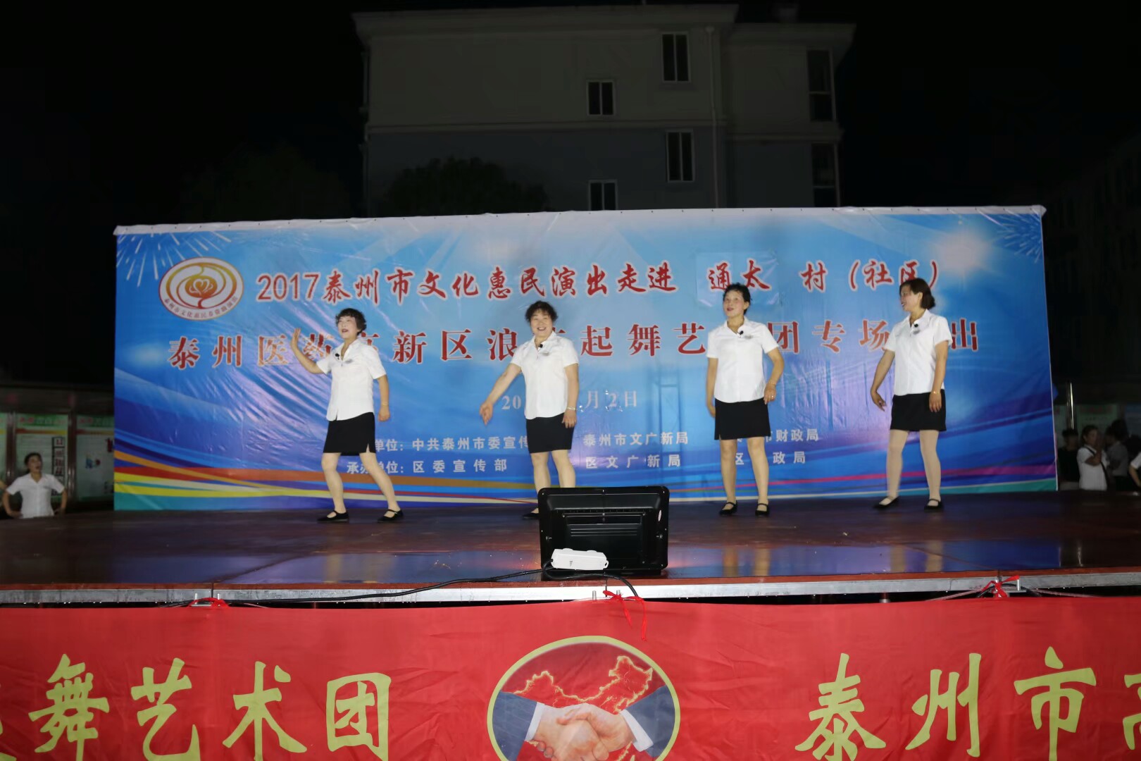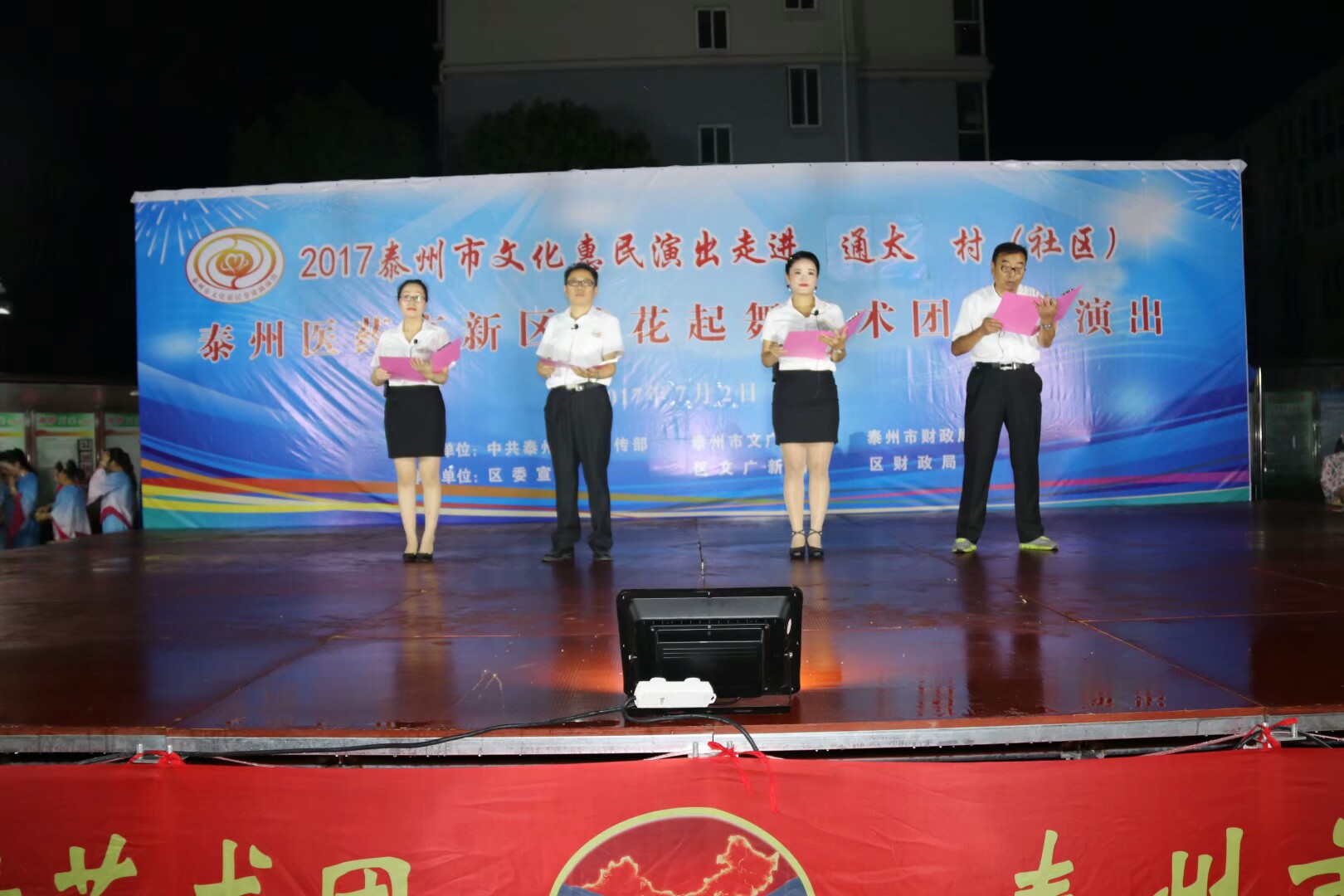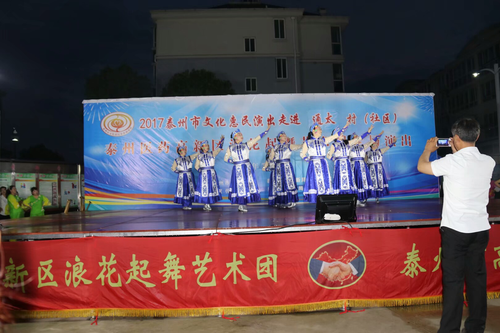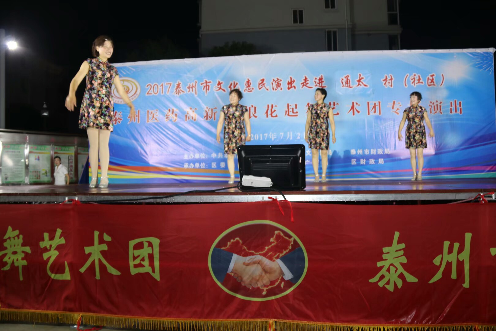 2017年7月2日晚,位于高港区刁铺街道育才小区的广场人头攒动,热闹非凡。应高港区刁铺街道通太社区的邀请,高港区浪花起舞艺术团今天走进通太社区,为社区居民展示精美的文化大餐。这次演出我团共45人参加,演出节目16个,随着欢快喜庆的音乐想起,舞蹈《张灯结彩》拉开了演出序幕,节目内容丰富多彩,有快板、诗朗诵、地方戏唱段等,表演唱《四大嫂夸健康》更是把演出推向高潮,获得经久不息的掌声,每个节目都深受社区观众的喜爱,演出现场气氛十分火爆,观看人数达500人左右,近2小时的演出,让观众流连忘返,深受通太社区干群的一致好评!
