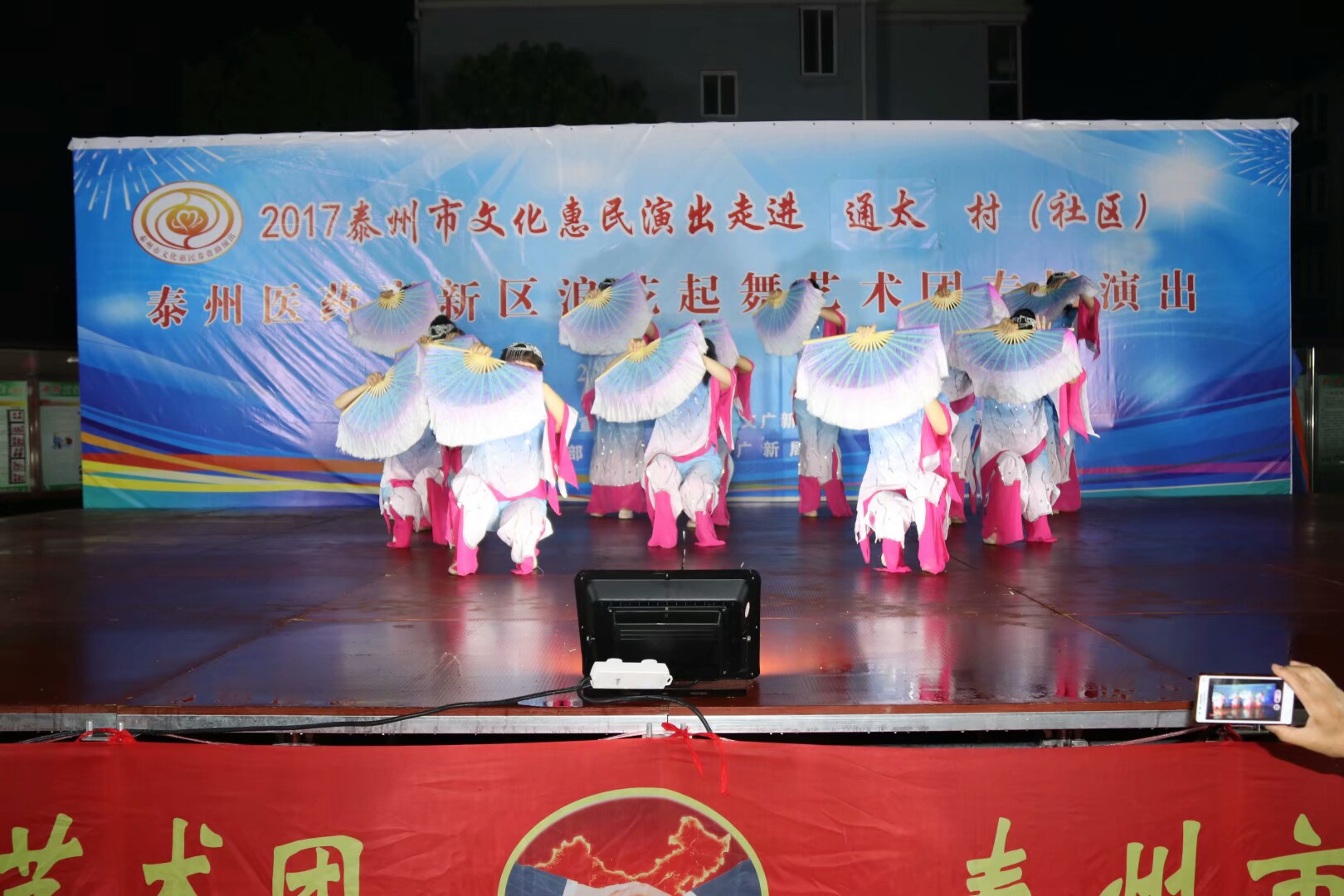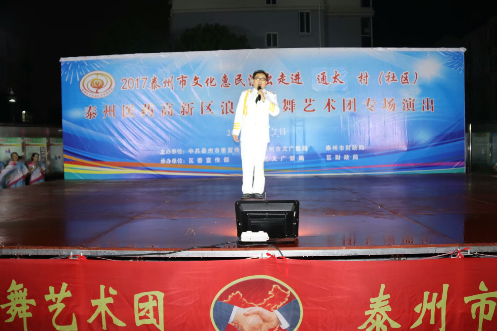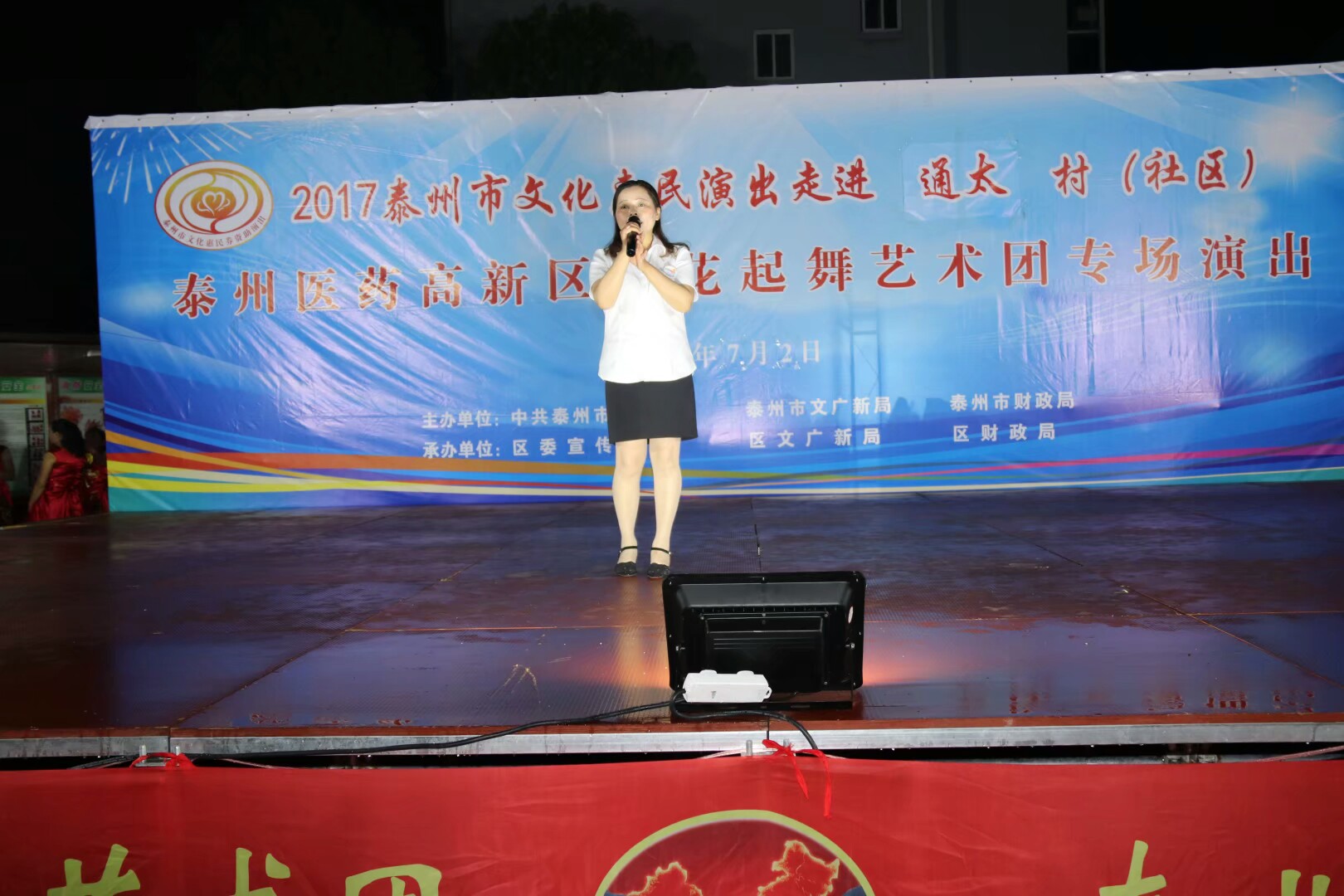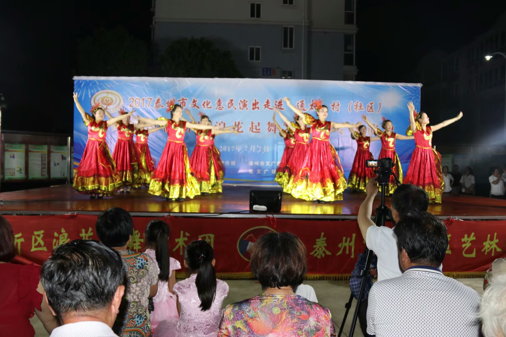 2017年7月2日晚,位于高港区刁铺街道育才小区的广场人头攒动,热闹非凡。应高港区刁铺街道通太社区的邀请,高港区浪花起舞艺术团今天走进通太社区,为社区居民展示精美的文化大餐。这次演出我团共45人参加,演出节目16个,随着欢快喜庆的音乐想起,舞蹈《张灯结彩》拉开了演出序幕,节目内容丰富多彩,有快板、诗朗诵、地方戏唱段等,表演唱《四大嫂夸健康》更是把演出推向高潮,获得经久不息的掌声,每个节目都深受社区观众的喜爱,演出现场气氛十分火爆,观看人数达500人左右,近2小时的演出,让观众流连忘返,深受通太社区干群的一致好评!