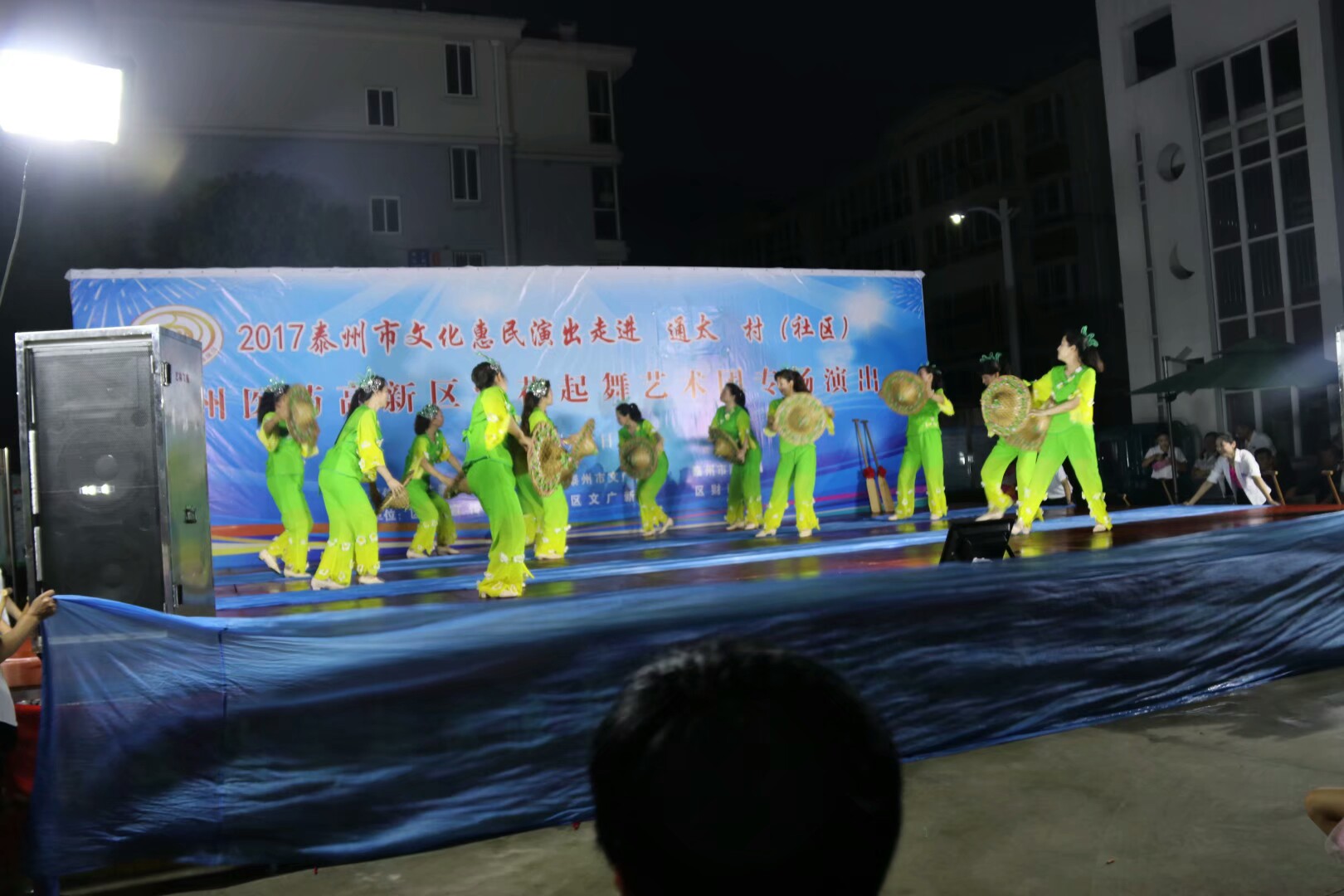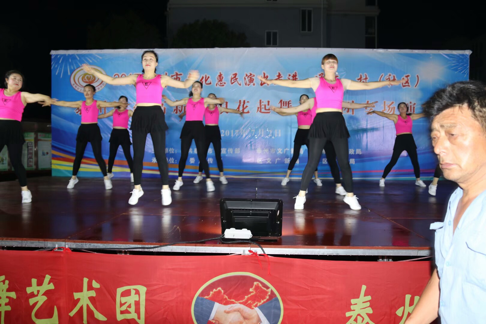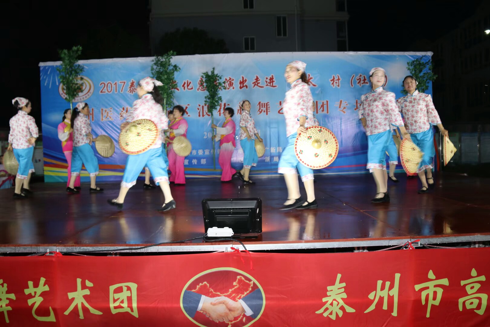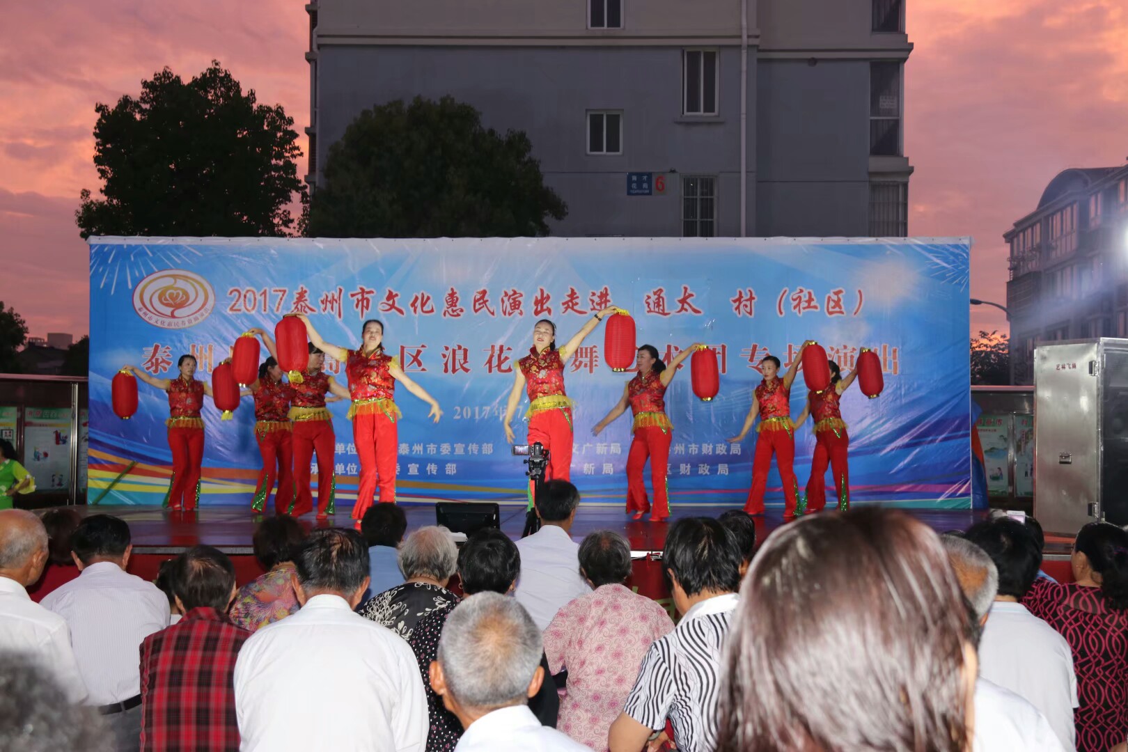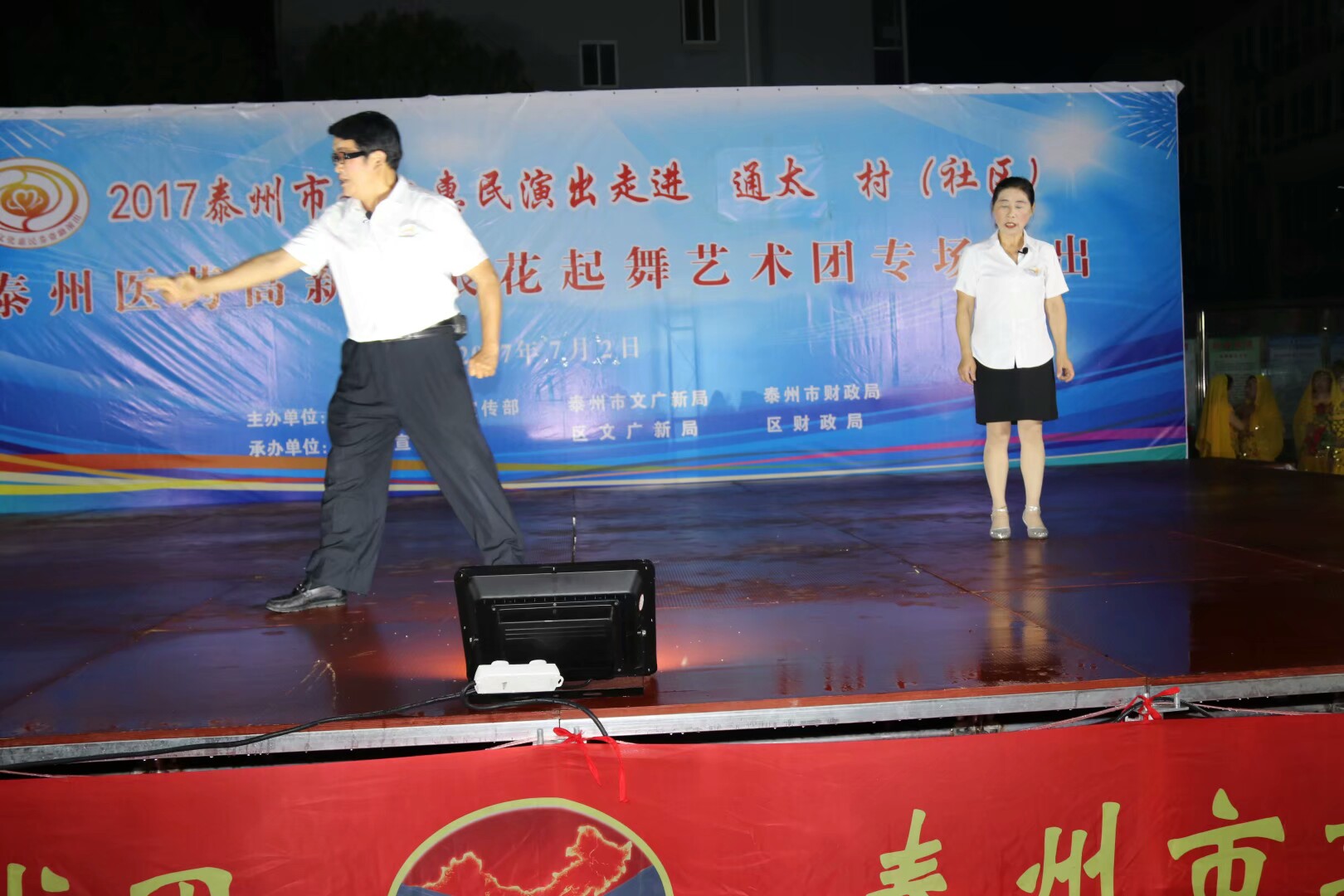 2017年7月2日晚,位于高港区刁铺街道育才小区的广场人头攒动,热闹非凡。应高港区刁铺街道通太社区的邀请,高港区浪花起舞艺术团今天走进通太社区,为社区居民展示精美的文化大餐。这次演出我团共45人参加,演出节目16个,随着欢快喜庆的音乐想起,舞蹈《张灯结彩》拉开了演出序幕,节目内容丰富多彩,有快板、诗朗诵、地方戏唱段等,表演唱《四大嫂夸健康》更是把演出推向高潮,获得经久不息的掌声,每个节目都深受社区观众的喜爱,演出现场气氛十分火爆,观看人数达500人左右,近2小时的演出,让观众流连忘返,深受通太社区干群的一致好评!