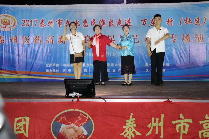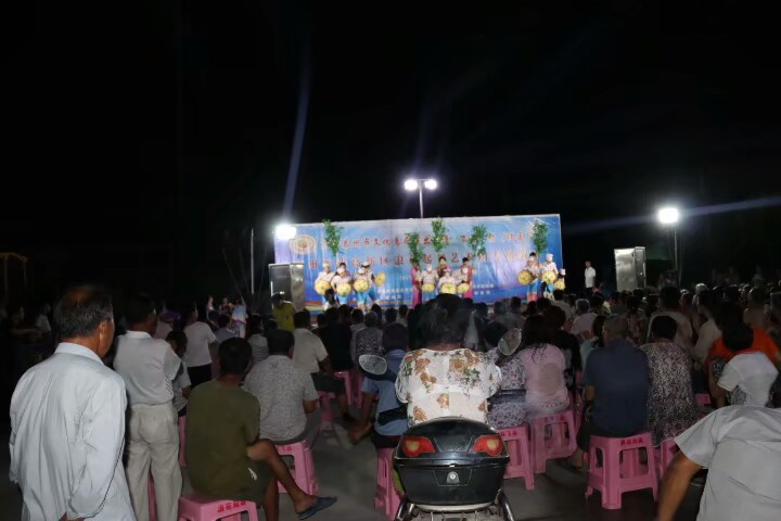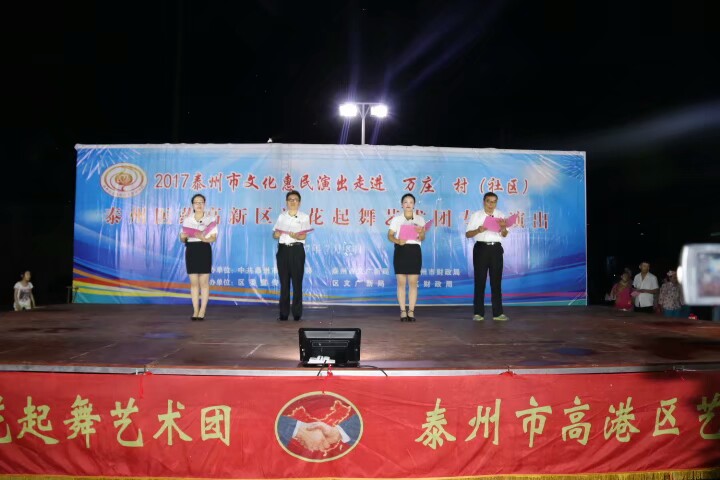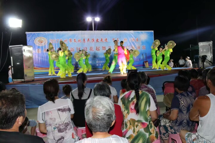 2017年7月,我团应高港区刁铺街道万庄社区的邀请,于7月8日晚去社区广场开展惠民演出,为适应观众不同层次的文化欣赏需求,我团精心策划了16个丰富多彩的文艺节目,随着欢快喜庆的音乐响起,舞蹈《张灯结彩》拉开了演出序幕,越剧《相爷堂内把话传》获得了观众们经久不息的掌声,整场演出,气氛热烈,掌声不断,赢得了社区干群的一致好评,当晚演出人员共45人,演出时长近2小时,观众达到300多人,精彩的表演,给万庄居民送去一份丰盛的文化大餐!