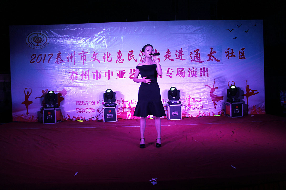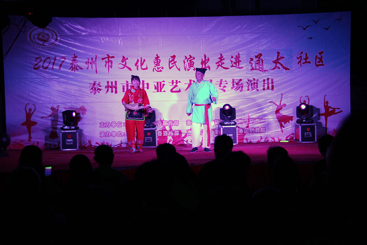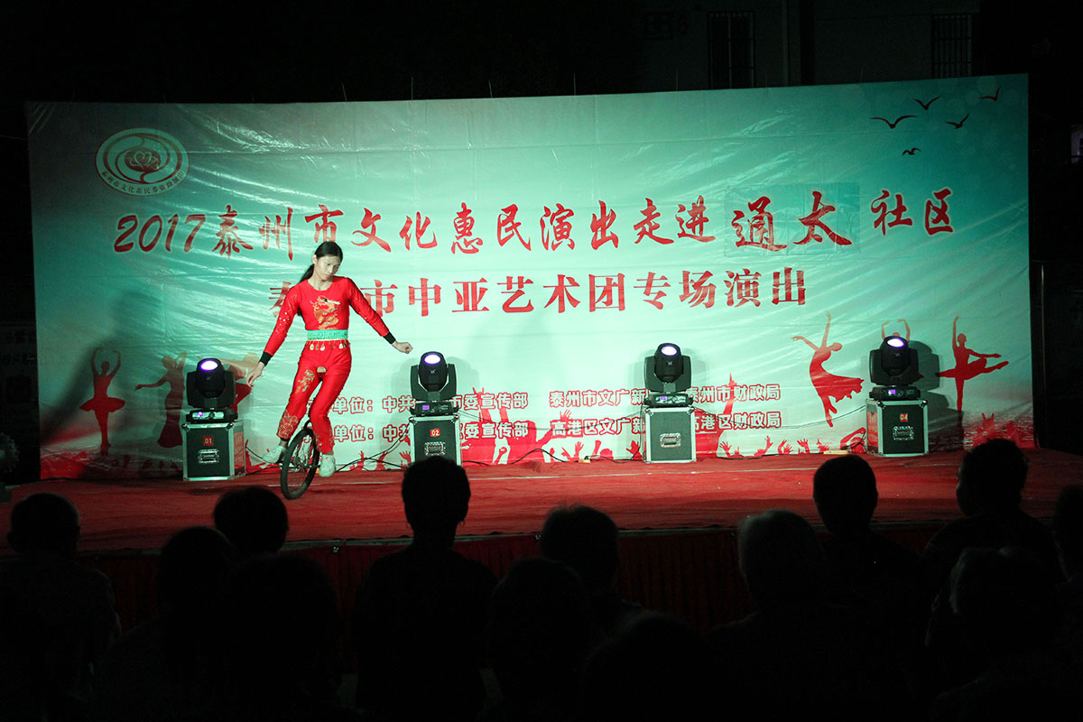 8月25日晚中亚艺术团,来到通太社区进行惠民演出,由于社区里面宣传得早,晚上7点不到,老百姓早早地来到演出现场。惠民演出围绕文明城市创建工作的总体要求和基本内容,艺术团精心编排了十多个节目。有舞蹈,独唱,魔术,方言韵白,方言小品,杂技、黄梅戏等精彩片段,演出内容丰富,节目形式多样,现场气氛热烈,观众掌声不断,活动结束后,社区民众对惠民演出给予了很好的评价和赞赏。